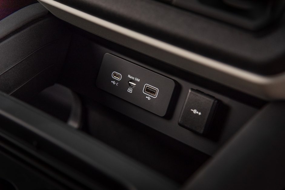 ส่วนหนึ่งของช่องเสียบสำหรับเชื่อมต่อและชาร์จอุปกรณ์ต่างๆ ซึ่งมีให้หลายจุดทั่วห้องโดยสาร