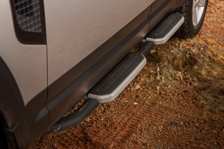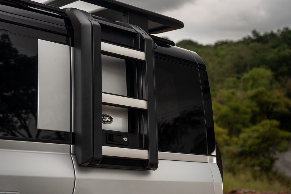 บันไดและแร็คหลังคาเป็นอุปกรณ์สั่งติดตั้งพิเศษเช่นกัน หลังคาของ Defender สามารถรับน้ำหนักได้สูงสุดถึง 300 กก. นั่นหมายถึงคุณสามารถกางเต็นท์นอนบนนั้นได้ 2 คน อย่างไรก็ตาม แร็คหลังคาสร้างเสียงลมดังสนั่นเข้ามาในห้องโดยสารตั้งแต่ความเร็วแค่ราวๆ 100 กม./ชม. ขึ้นไป