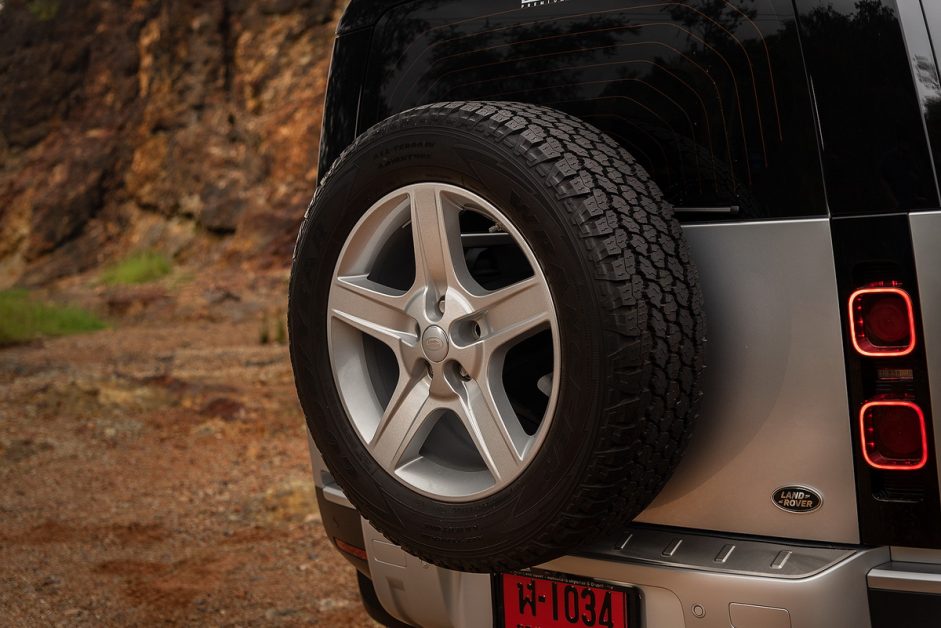 ของขวัญชิ้นพิเศษที่ทีมออกแบบ Land Rover มอบให้สาวก Defender ก็คือยางอะไหล่แบบห้อยไว้ท้ายรถ มันอาจจะบดบังกระจกหลังไปบ้าง แต่ใครแคร์ล่ะ?!?!