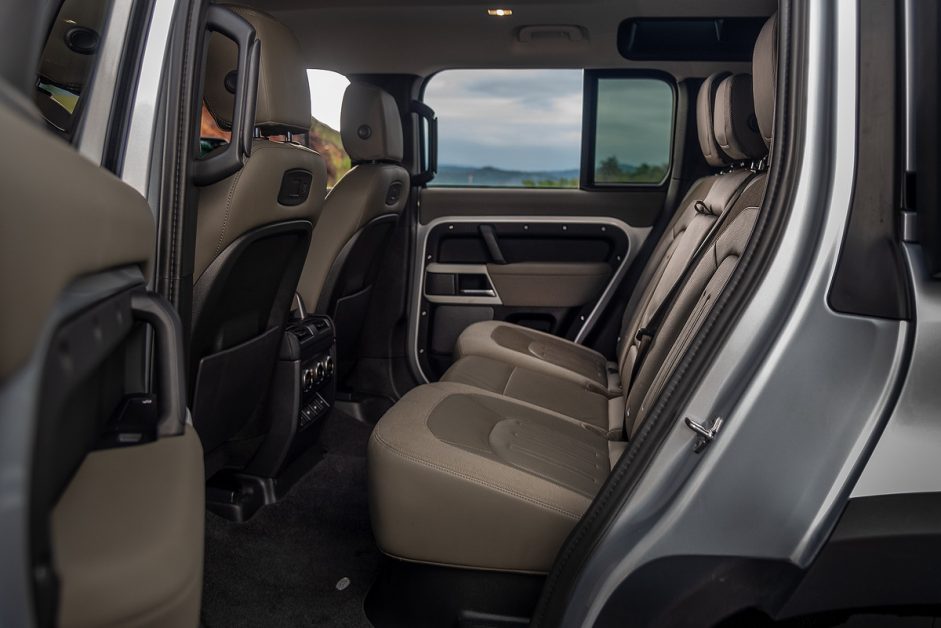 คุณจะได้พื้นที่เบาะหลังเหลือเฟือ ดังที่คาดหวังได้จากความใหญ่โตของรถ บวกด้วยช่องกระจกบานเล็กบนหลังคา เอกลักษณ์เฉพาะตัวของ Defender ที่ทีมออกแบบไม่ลืมใส่มาให้ในรถรุ่นใหม่