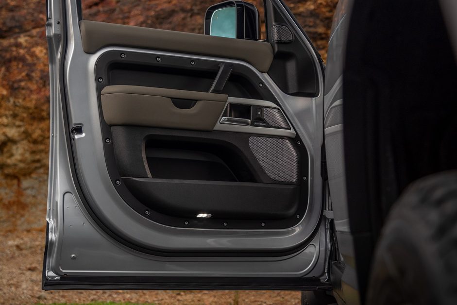 ถ้าคุณอยากรู้ขนาดความใหญ่โตของประตูล่ะก็… เบาะรองนั่ง (ของเบาะหน้า) อยู่ในระดับต่ำกว่าที่พักแขนเพียงเล็กน้อยเท่านั้น สองในสามส่วนที่เหลือของแผงประตูอยู่บริเวณใต้ขาของคุณไปจนถึงพื้นรถ! การตกแต่งด้วยหมุดน็อตรอบๆ ขอบ เพิ่มภาพลักษณ์บึกบึนได้เป็นอย่างดี