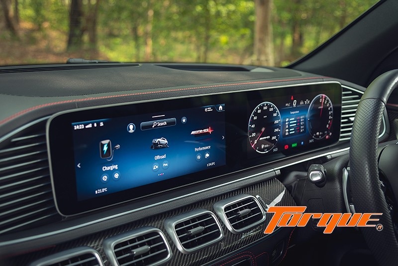 อินเตอร์เฟสทั้งหมดออกแบบขึ้นใหม่เฉพาะ AMG เท่านั้น พร้อมเพิ่มเมนูเกี่ยวกับระบบ Hybrid (ซึ่งออกแบบขึ้นสำหรับเกรด AMG โดยเฉพาะเช่นกัน) อาทิ ข้อมูลการชาร์จ, ระยะทางที่วิ่งได้, อุณหภูมิของแบตเตอรี่ HV เป็นต้น เหล่านี้รวมถึงฟังก์ชั่นอื่นๆ รันบนระบบปฏิบัติการ MBUX เจเนอเรชั่นที่ 2 เวอร์ชั่นล่าสุด ร่วมด้วยระบบสั่งการด้วยเสียง “Hey Mercedes” ที่อัพเดตให้สามารถสั่งปรับสีของไฟบรรยากาศและเปิดปิดม่านบังแดดได้ด้วยเสียง มันจดจำที่มาของเสียง (จากผู้ขับ หรือผู้นั่งตำแหน่งอื่นๆ) ได้ และบางฟังก์ชั่น เช่น โทรออกหรือรับสาย สามารถใช้คำสั่งเสียงได้ทันทีโดยไม่ต้องเรียก “Hey Mercedes”