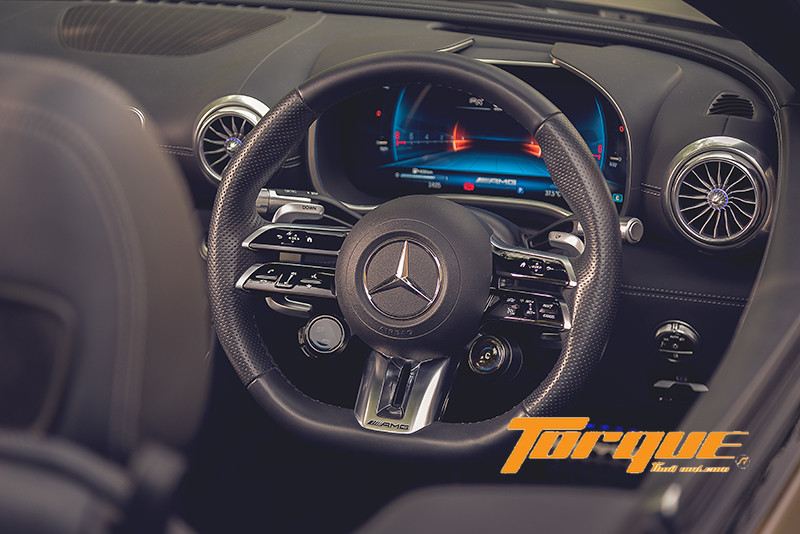 เป็นครั้งแรกของ SL ที่ติดตั้งชุดเกียร์ AMG SPEEDSHIFT MCT 9G มาให้เป็นอุปกรณ์มาตรฐาน จุดเด่นอยู่ที่การใช้คลัตช์น้ำมันแบบหลายแผ่นแทนทอร์คคอนเวอร์เตอร์ ซึ่งมีข้อดีหลายประการ ทั้งทำให้ชุดเกียร์มีน้ำหนักเบากว่า จากขนาดที่กะทัดรัด ที่สำคัญก็คือ สามารถเปลี่ยนเกียร์จากเกียร์สู่เกียร์ได้เร็วระดับสายฟ้าฟาดที่ 100 มิลลิวินาที ในโหมด Sport ขึ้นไป พร้อมระบบ Double-declutch ซึ่งเป็นเทคนิคเดียวกับที่นักแข่งใช้ในการขับขี่รถเกียร์ธรรมดาเมื่อต้องการเปลี่ยนลงเกียร์ต่ำ อธิบายสั้นๆ ก็คือ การเหยียบและปล่อยคลัตช์ 2 ครั้ง (อย่างรวดเร็ว) โดยเหยียบคลัตช์ครั้งแรกเพื่อปลดสู่เกียร์ว่าง จากนั้นปล่อยคลัตช์พร้อมเหยียบคันเร่งเพื่อเพิ่มรอบเครื่องให้แมทช์กับเกียร์ที่ต่ำลง แล้วเหยียบคลัตช์อีกครั้งเพื่อเข้าเกียร์ และปล่อยคลัตช์ ด้วยวิธีนี้ทำให้เกียร์และเครื่องยนต์หมุนที่ความเร็วใกล้เคียงกัน… ฟังดูยากและวุ่นวาย แต่เกียร์ MCT ทำทั้งหมดนี้ให้คุณอัตโนมัติ… ระบบ Double-declutch ช่วยให้คุณได้เพลิดเพลินไปกับอรรถรสแบบเกียร์ธรรมดา โดยเฉพาะอย่างยิ่งเมื่อเปลี่ยนเกียร์เองในโหมด Manual ผ่านแพดเดิลหลังพวงมาลัย