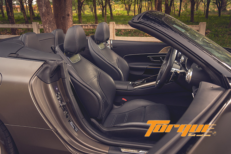 เบาะนั่ง AMG Performance ทรงสปอร์ต หุ้มด้วยหนัง Nappa สุดหรู สามารถปรับได้หลายทิศทาง พร้อมระบบนวดและปีกเบาะที่สามารถปรับให้กระชับขึ้นได้อัตโนมัติเมื่อเลือกการขับขี่โหมด Sport ขึ้นไป และยังมีระบบ AIRSCARF ซึ่งใช้พัดลมทำหน้าที่ดูดอากาศ (จากด้านหลังพนักพิงศีรษะ) เข้ามาปล่อยในระดับคอของผู้นั่ง ออกแบบมาเพื่อการขับขี่ในฤดูหนาว (ทั้งเปิดและปิดหลังคา) โดยอากาศอุ่นที่ปล่อยออกมาจะหมุนวนอยู่บริเวณรอบลำคอจนเหมือนกับ “ผ้าพันคออากาศ” ตามชื่อของมันนั่นเอง