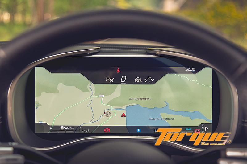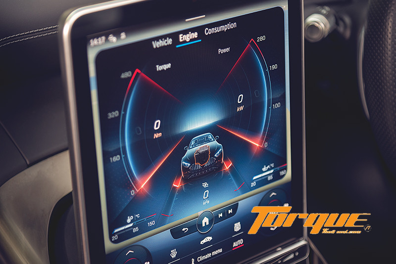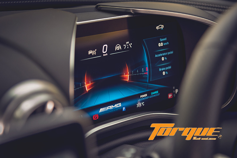 นอกจากระบบความบันเทิงแล้ว หน้าจอส่วนกลางยังเป็นพื้นที่สำหรับการแสดงผลด้านสมรรถนะของรถอีกด้วย เพียงกดปุ่ม “AMG” บนบาร์ระบบสัมผัสแบบ Haptic ใต้หน้าจอ คูณจะเข้าสู่เมนูการแสดงข้อมูลประสิทธิภาพและการทำงานต่างๆ ของรถ อาทิ แรงม้า, แรงบิด, แรงกระทำด้านข้าง ไปจนถึงสถานะของรถแบบเรียลไทม์ เช่น แรงดันลมยาง, อุณหภูมิของเหลว (น้ำมันเครื่อง, หม้อน้ำ เป็นต้น) นอกจากนั้น ยังมีเมนู AMG ‘TRACK PACE’ ซึ่งใช้ซอฟต์แวร์ร่วมกับระบบ MBUX เพื่อบันทึกข้อมูลของรถกว่า 80 รายการ อาทิ ความเร็ว, อัตราเร่ง, องศาพวงมาลัย, การเหยียบเบรก ฯลฯ ได้ถึง 10 ครั้งต่อวินาที ขณะขับขี่ในสนามแข่ง พร้อมการแสดงเวลาต่อรอบและเวลาแต่ละเซกชั่นของสนามขึ้นบนจอส่วนกลาง, กระจกหน้า (ผ่าน HUD) และจอสำหรับผู้ขับขี่ได้ โดยคุณสามารถบันทึกสนามของตัวเอง (เช่นสนามพีระฯ สนามช้างฯ เป็นต้น) เข้าไปในระบบได้ จากนั้นระบบจะแสดงองศาการเข้าโค้งและจุดเบรกที่เหมาะสมของสนาม เพื่อช่วยให้คุณสามารถหาไลน์ที่เหมาะสมได้ง่ายยิ่งขึ้น จากนั้น คุณสามารถบันทึกไลน์ต่างๆ ไว้ เพื่อให้ระบบนำขึ้นมาแสดงผลบนหน้าจอมัลติมีเดียเพื่อเป็นไกด์ในการปรับปรุงการขับขี่ของคุณต่อไปได้อีกด้วย