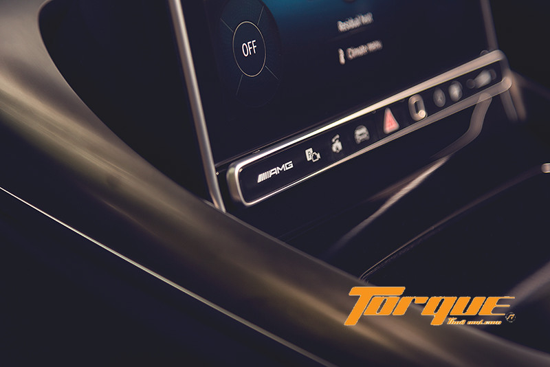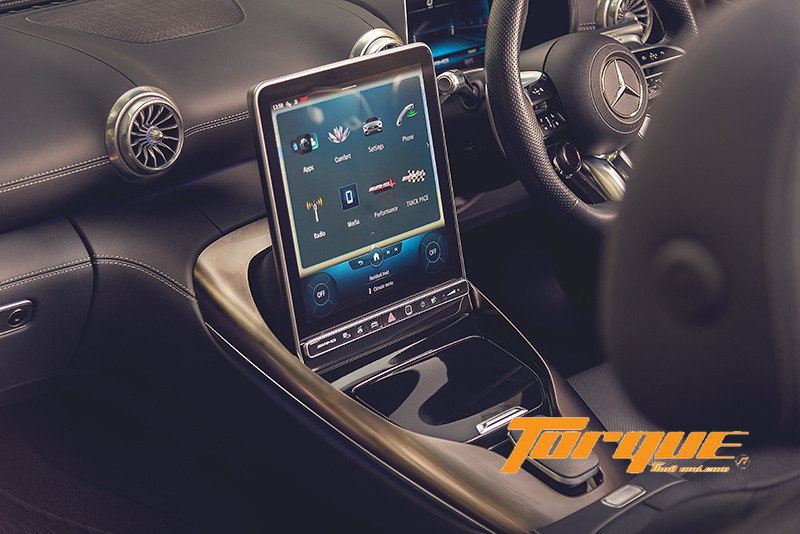 ดีไซน์ของคอนโซลกลางเลียนแบบช่องดักอากาศทรง NACA ที่รถสปอร์ตในอดีตนิยมใช้… จอส่วนกลางแนวตั้งขนาดใหญ่ถึง 11.9 นิ้ว ระบบสัมผัส ทำงานด้วยระบบปฏิบัติการ MBUX เวอร์ชั่นใหม่ล่าสุด (เจเนอเรชั่นที่ 2) มีหลายฟังก์ชั่นที่นำมาจาก S-class จึงมั่นใจได้ในด้านความหรูหราสะดวกสบาย User Interface เป็นดีไซน์ที่ออกแบบขึ้นเฉพาะรถตระกูล AMG เท่านั้น แน่นอนว่าทุกการควบคุมถูกรวบรวมไว้บนหน้าจอนี้ พร้อมซอฟต์แวร์ใหม่ที่สามารถทำงานได้อย่างรวดเร็ว คุณสามารถเรียกดูข้อมูลต่างๆ ได้จากก้านควบคุมระบบสัมผัสแบบ Haptic บนพวงมาลัย หรือที่ทัชแพดบนคอนโซลกลาง ชุดลำโพงรอบทิศทาง Burmester 3D Surround Sound System ติดตั้งมาให้เป็นอุปกรณ์มาตรฐาน