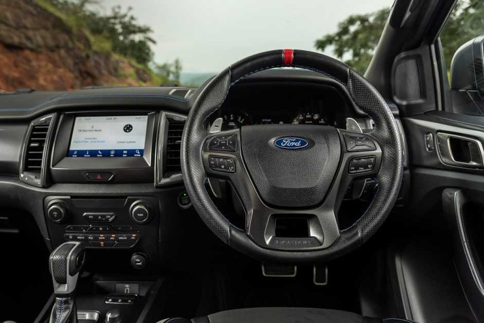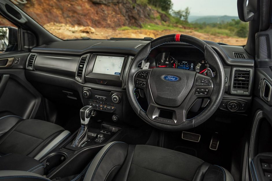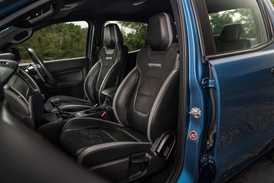 ผสมผสานไปกับการเพิ่มเติมในส่วนของรายละเอียด เช่น โทนสี และวัสดุ ซึ่งผ่านการออกแบบให้เหมาะสมกับการใช้งานทั้ง On Road และ Off Road พร้อมด้วยการแสดงตัวตนความเป็นรถกระบะรุ่นท็อปสุดในตลาด ด้วยการปักอักษร Raptor ที่พนักพิง ประกอบกับพวงมาลัยพร้อมตำแหน่งมาร์คสีแดงที่ตำแหน่ง 12 นาฬิกา ที่มากับด้านหลังเป็นแป้นเปลี่ยนเกียร์ Paddle Shift ขนาดใหญ่ผลิตจากแม็กนีเซียมน้ำหนักเบา