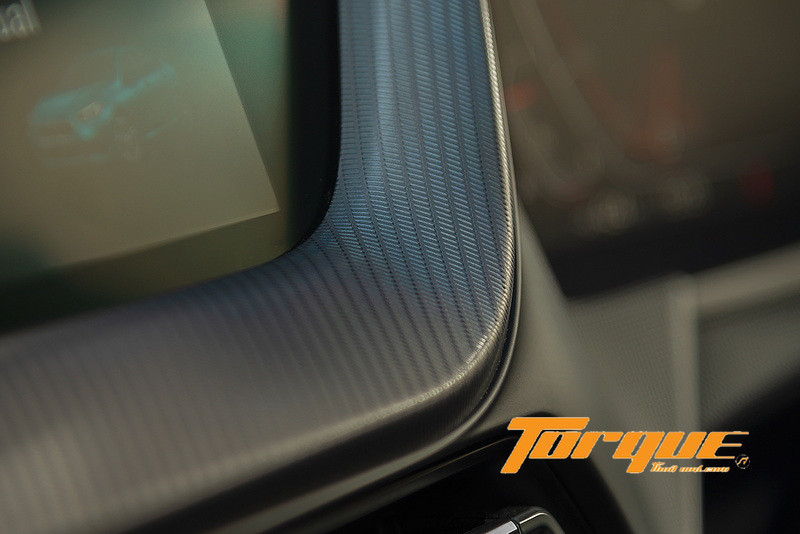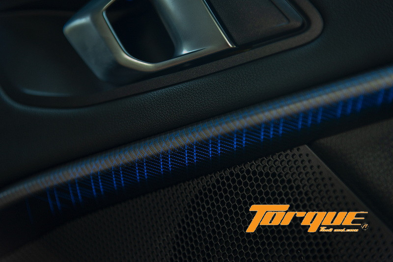 ใช้วัสดุตกแต่งหลากหลายชนิดภายในห้องโดยสาร ไม่ว่าจะเป็นสีดำเงา, ลวดลายสีเงิน และที่โดดเด่นคือแถบคาดที่แผงประตูซึ่งเห็นเป็นลวดลายสีเงินปกติเวลากลางวัน แต่จะเรืองแสงตามสีไฟที่เลือกได้ 6 สี… รายละเอียดเล็กๆ น้อยๆ ที่น่าประทับใจ