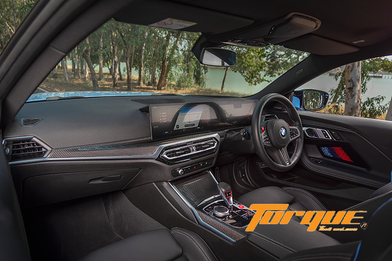 จอแสดงผลทรงโค้งหันเข้าหาผู้ขับ ‘BMW Curved Display” ตั้งตระหง่านทอดยาวเกินครึ่งหนึ่งของแดชบอร์ด ภายในประกอบด้วยจอแสดงผล 2 ชุด คือ จอสำหรับผู้ขับซึ่งสามารถปรับแต่งรูปแบบกราฟฟิกและเรียกดูข้อมูลได้หลากหลาย โดยเมื่อเลือกเปลี่ยนเกียร์เองแบบ Manual จอจะแสดงตัวเลขตำแหน่งเกียร์ขนาดใหญ่ไว้ตรงกลาง พร้อมสัญญาณเตือนเปลี่ยนเกียร์ ให้เห็นเด่นชัด นอกจากนั้น ยังระบบ Head-up Display ที่จะตัดคอนเทนต์รองออกไป เหลือไว้เพียงข้อมูลสำคัญสำหรับการขับในสนาม เมื่อเลือกใช้โมหด Track จออีกชุดสำหรับระบบอินโฟเทนเมนต์และการปรับแต่งค่าอย่างละเอียดต่างๆ ของรถ พิเศษด้วยการแสดงข้อมูลเกี่ยวกับสมรรถนะของรถและแสดงผลการขับขี่ต่างๆ ซึ่งมีให้เฉพาะรถตระกูล M เท่านั้น