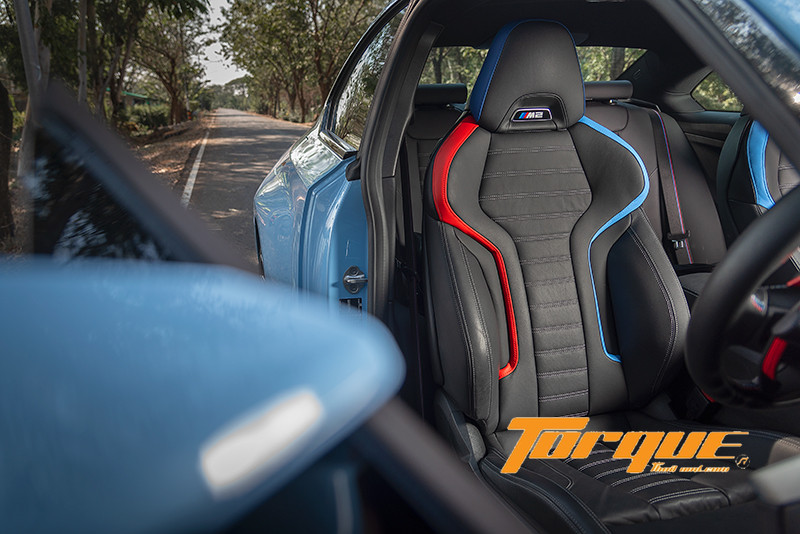เบาะนั่งทรงสปอร์ต ได้รับการออกแบบขึ้นใหม่โดยเพิ่มส่วนปีกเบาะให้สูงขึ้นเพื่อโอบรับร่างกายได้กระชับกว่าเดิม โลโก้ “M2” บริเวณพนักพิงศีรษะเป็นแบบเรืองแสง และมาพร้อมกับสายเข็มขัดนิรภัยตกแต่งแถบสี M เข้าชุดกัน นอกจากนั้น หากคุณเลือก M2 ที่มาพร้อมแพคเกจ ‘M Race Track’ จะได้เบาะแบบ Bucket ผลิตจากคาร์บอนไฟเบอร์ ตัดน้ำหนักออกไปได้ถึง 10.8 กก. ทั้งยังมีช่องบนเบาะสำหรับติดตั้งเข็มขัดนิรภัยแบบใช้ในการแข่งขันเตรียมไว้ให้เรียบร้อย พื้นที่ในห้องโดยสารไม่กว้างขวางนัก โดยเฉพาะกับคนที่สูง 175 ซม. ขึ้นไป จะเหลือเฮดรูมน้อยมากจนศีรษะอาจติดกับเพดานในบางจังหวะหากขับขี่โดยสวมหมวกกันน็อค เช่นเดียวกับเบาะหลังที่แม้จะมีพื้นที่วางขามากกว่ารุ่นก่อนหน้านี้ 5 ซม. แต่ก็ยังนั่งไม่สบายอยู่ดี