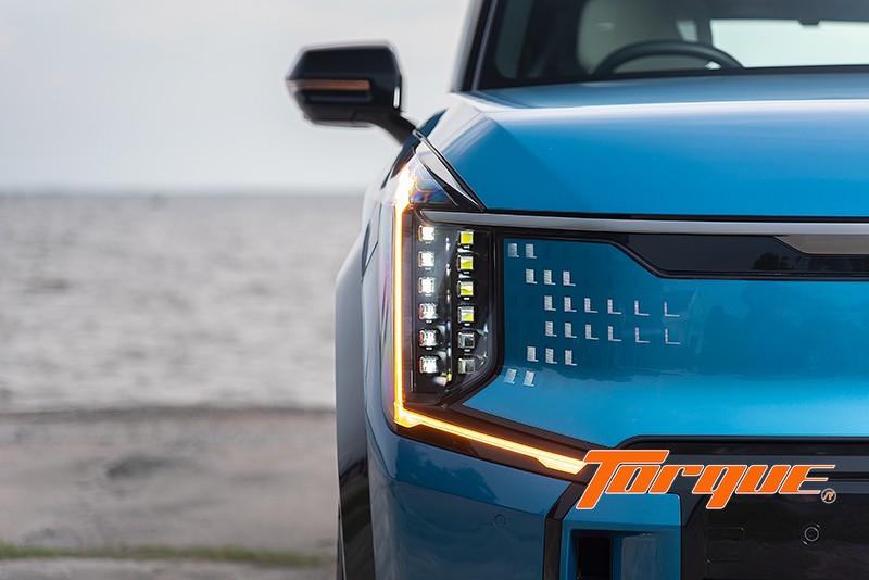 Kia EV9 GT-Line AWD มองผ่านๆ จะเห็นถึงงานดีไซน์ที่นำเสนอ ความล้ำสมัย สไตล์โลกดิจิตอล เหมือนกัน EV5 แต่ถูกยกระดับไปอีกขั้น เช่น Digital Tiger Face ในมุมมองด้านหน้า ซึ่งประกอบด้วย ไฟหน้าแนวตั้งช่วยเพิ่มความรู้สึกสง่างาม พร้อมกระจังหน้าสีเดียวกับตัวรถ ช่วยเน้นความโดดเด่นของ Tiger nose