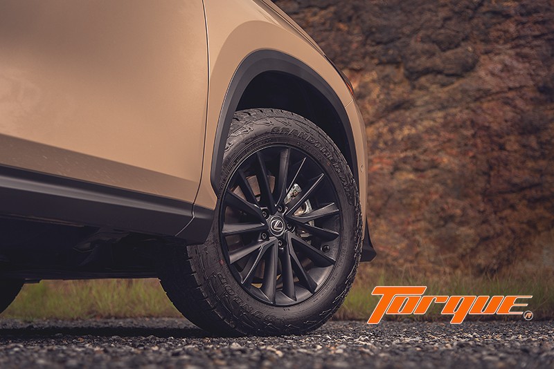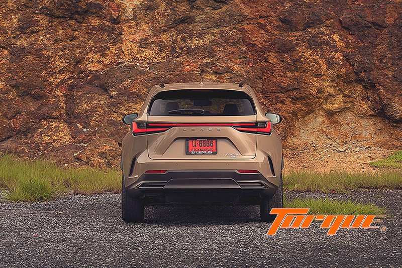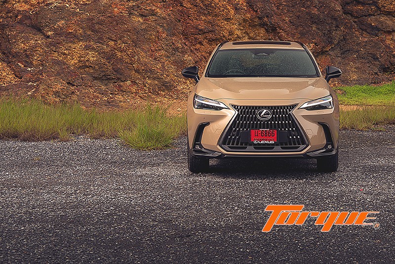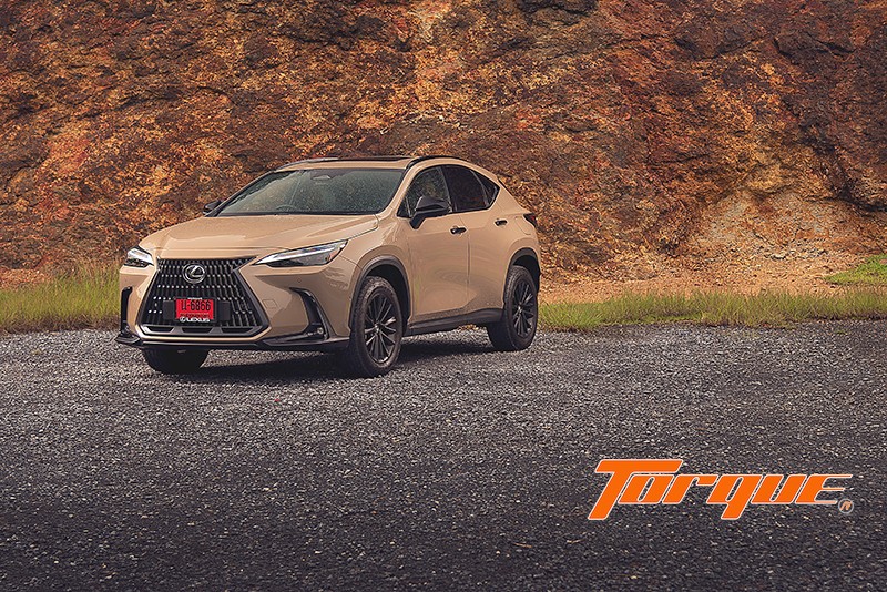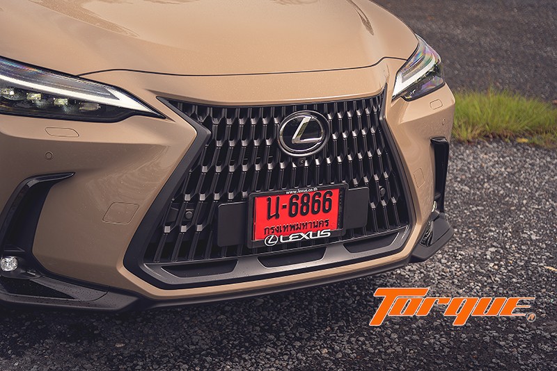 NX มีเส้นสายที่ฉวัดเฉวียนตามสไตล์ Lexus ทว่าถูกลดทอนความหวือหวาลงจนทำให้มันดูบึกบึนสมความเป็น SUV ยิ่งขึ้น (เมื่อเทียบกับ UX ที่ขี้เล่นเกินไป หรือ RX ที่ดูขาดๆ เกินๆ) โดยเฉพาะอย่างยิ่งกับคันทดสอบของเราในเกรด ‘Overtrail’ ที่ให้อารมณ์แบบรถสไตล์ Cross Country มาพร้อมกับสีพิเศษเฉพาะเกรดนี้ ‘Moon Desert’ และยาง All-Terrain บวกการตกแต่งชิ้นส่วนกระจุกกระจิกภายนอกด้วยสีดำ มีการเพิ่มประสิทธิภาพทางอากาศพลศาสตร์ด้วยช่องระบายแรงดันอากาศที่กันชนหน้าและหลัง ร่วมกับครีบใต้กันชนหลัง ทั้งหมดเพื่อช่วยให้รถทรงตัวได้เสถียรยิ่งขึ้นเมื่อวิ่งทางตรง ขณะที่ใต้ท้องรถมีการขยายพื้นที่ติดตั้งแผ่นปิดใต้ท้องให้มากยิ่งขึ้น เพื่อลดแรงต้านอากาศซึ่งส่งผลดีต่ออัตราสิ้นเปลืองเชื้อเพลิง ที่พิเศษก็คือแผ่นปิดบริเวณใต้ห้องเครื่องที่ใช้พื้นผิวแบบลูกกอล์ฟ รอยบู๋มเหล่านี้จะทำหน้าที่สร้าง Vortex เล็กๆ จำนวนมาก เกิดเป็นแรงดูดทำให้รถกดแน่นกับถนนยิ่งขึ้น