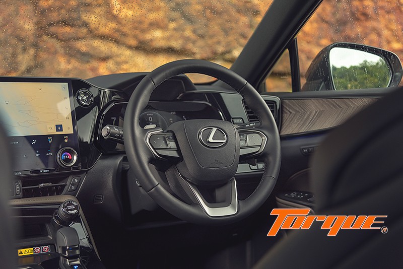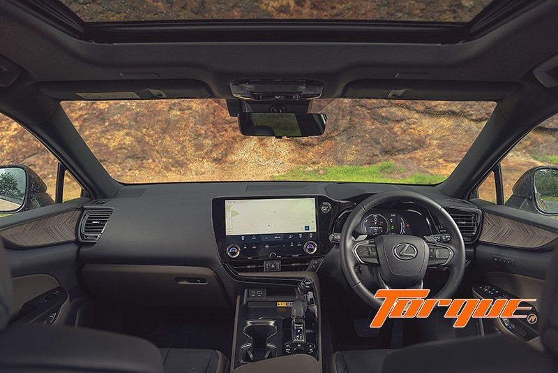 NX เป็นรถรุ่นแรกของ Lexus ที่นำแนวคิด “Tazuna” – คำที่ใช้เรียกวิธีการบังคับม้าของผู้ขี่ – มาใช้ในการออกแบบห้องโดยสาร มุ่งเน้นให้ผู้ขับได้สัมผัสการควบคุมรถที่ Direct และเป็นธรรมชาติ พวงมาลัยออกแบบโดยคำนึงถึงตำแหน่งการวางมือและนิ้วโป้งให้จับได้ถนัดมือยิ่งขึ้น เช่นเดียวกับการจัดวางตำแหน่งเบาะที่นำข้อมูลซึ่งรวบรวมมาจากการวัดระยะจากไหล่ถึงปลายนิ้วของคนที่มีรูปร่างแตกต่างกันจากทั่วโลก มาเป็นพื้นฐานในการกำหนด จนได้มาซึ่งต่ำแหน่งการขับขี่ที่ลงตัว นอกจากนั้น Lexus ยังใส่ใจเรื่องความเงียบสงบในห้องโดยสาร อันเป็นเอกลักษณ์สำคัญของพวกเขา ด้วยการใช้กระจกหน้าและกระจกหน้าต่างคู่หน้าแบบลดเสียงรบกวน ร่วมด้วยรายละเอียดปลีกย่อยที่น่าทึ่ง ทั้งการใช้ตัวล็อคฝากระโปรงหน้าแบบคู่เพื่อเพิ่มความแน่นหนา ลดการสั่นสะเทือนที่ทำให้เกิดเสียงรบกวน, ฐานของเสา A และ B เคลือบด้วยโฟมชนิดพิเศษ ตลอดจนการใช้ครีบขนาดเล็กที่ช่องรับอากาศด้านหน้าเพื่อลดเสียงของกระแสอากาศ… ในเกรด Overtrail ตกแต่งพิเศษด้วยโทนสี ‘Monolith’ และลายไม้ ‘Geo Layer’ สวยงามและให้อารมณ์กลมกลืนกับตัวถังสีพิเศษของรถ