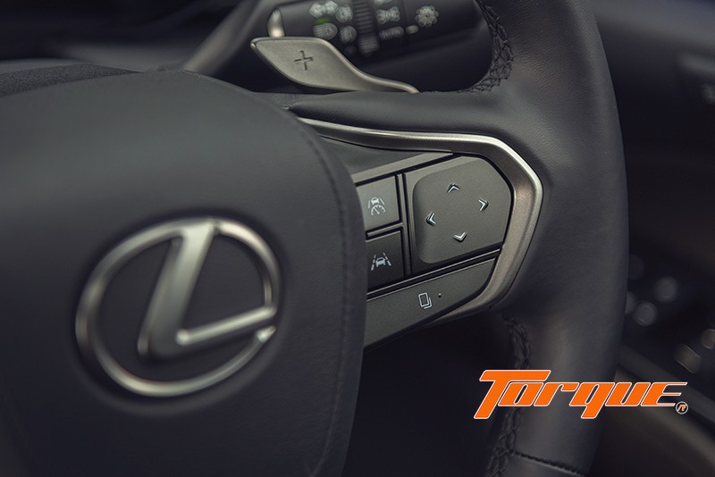 จอแสดงผลขนาด 8 นิ้ว สำหรับผู้ขับขี่ เน้นอินเตอร์เฟซที่เรียบง่ายเพื่อให้ผู้ขับอ่านค่าต่างๆ ได้รวดเร็ว สามารถเลือกการแสดงผลได้ 3 รูปแบบ มาพร้อมกับ HUD ที่ปรับแต่งได้ 3 รูปแบบเช่นกันคือ ‘Minimum Mode’ แสดงเฉพาะความเร็ว, ‘Standard Mode’ แสดงข้อมูลหลักเพิ่มที่ส่วนล่าง และ ‘Full Mode’ เพิ่มการแสดงผลระบบช่วยเหลือขณะขับขี่และสถานะของระบบ Lexus Safety System+ 023, 024 ปุ่มระบบสัมผัส 4 ทิศทาง บนพวงมาลัยเป็นส่วนหนึ่งของแนวคิด ‘Tazuna’ สามารถเลือกได้ว่าจะให้ปุ่มนี้ทำหน้าที่ควบคุมฟังก์ชั่นใด เช่น ระบบปรับอากาศ, ระบบกล้องรอบทิศทาง เป็นต้น จากนั้น ระบบจะแสดงผลบน HUD เมื่อคุณกดใช้งาน หรือหากปิด HUD ระบบจะเปลี่ยนมาแสดงผลที่หน้าจอของผู้ขับ