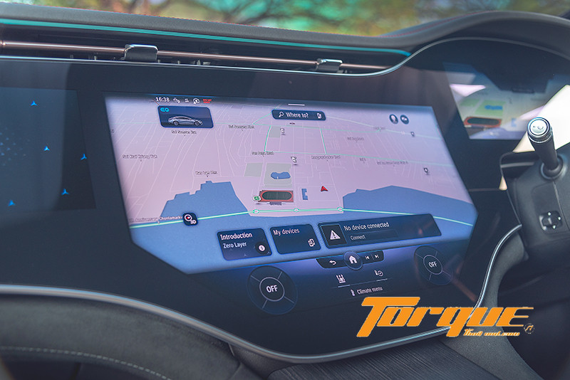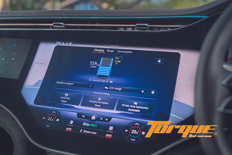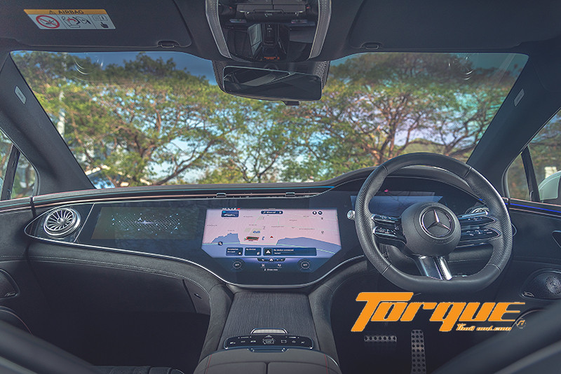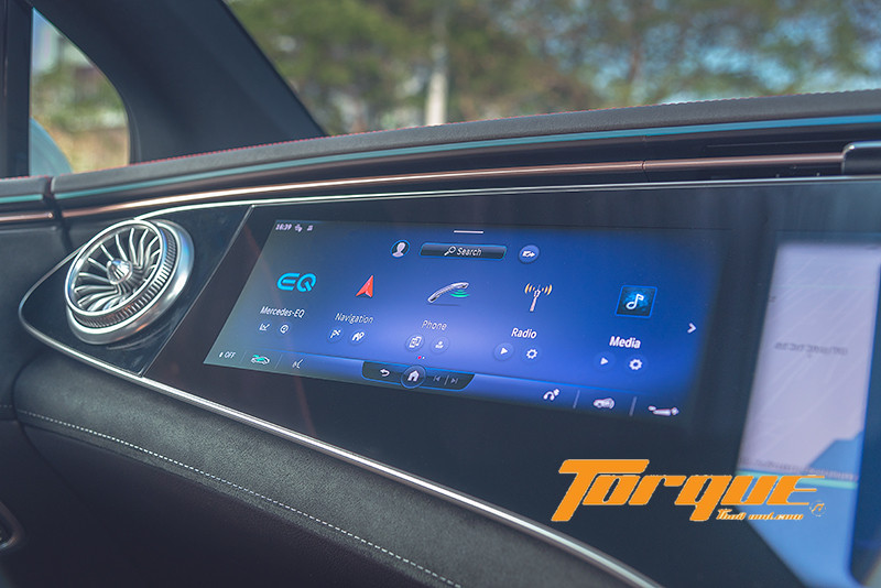 ปฏิเสธไม่ได้ว่า ‘Hyperscreen’ คือไฮไลต์สำคัญของ EQS ความน่าตื่นตาตื่นใจเริ่มตั้งแต่กระจกแบบชิ้นเดียวซึ่งยาวร่วม 1.4 เมตร ขึ้นรูปโค้งแบบ 3 มิติ ด้วยกรรมวิธีปั๊มโดยใช้ความร้อนสูง 650 องศาเซลเซียส ซึ่งเป็นวิธีเดียวกับที่ใช้ในการทำเลนส์ของกล้องถ่ายรูปและกระจกของโทรศัพท์มือถือ ทำให้สามารถมองเห็นหน้าจอทั้งหมดได้โดยไม่มีการ Distort สีดำที่เห็นเป็นการพิมพ์สีลงไปที่ด้านหลังของกระจกเพื่อให้ดูกลมกลืนแนบเนียนไปกับจอแสดงผล OLED พร้อมการเคลือบกระจกแบบพิเศษเพื่อให้สามารถทำความสะอาดรอยนิ้วมือได้ง่ายขึ้น ระบบ MBUX ‘Hyperscreen’ ประกอบด้วยจอแสดงผล 3 จอ สำหรับผู้ขับ (12.3 นิ้ว), จอส่วนกลาง (17.7 นิ้ว) และจอสำหรับผู้โดยสาร (12.3 นิ้ว) ซึ่งจะเป็น Screen Saver เมื่อไม่มีผู้นั่ง เพื่อความปลอดภัยขณะขับขี่ มีระบบ Haptic ตอบสนองด้วยการสั่นเมื่อกด ที่จอส่วนกลางและของผู้โดยสาร