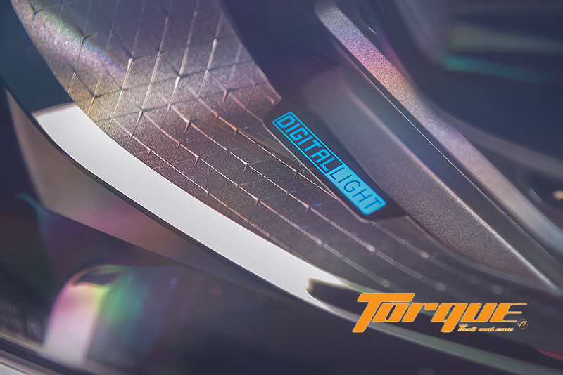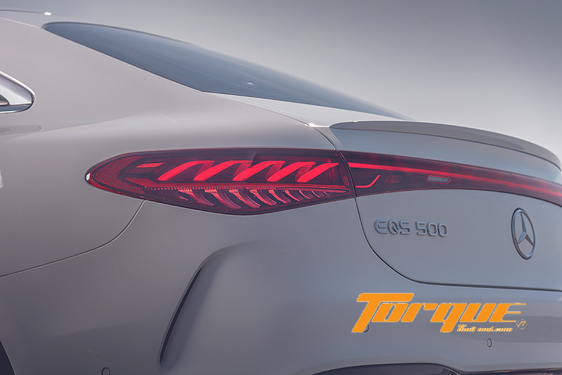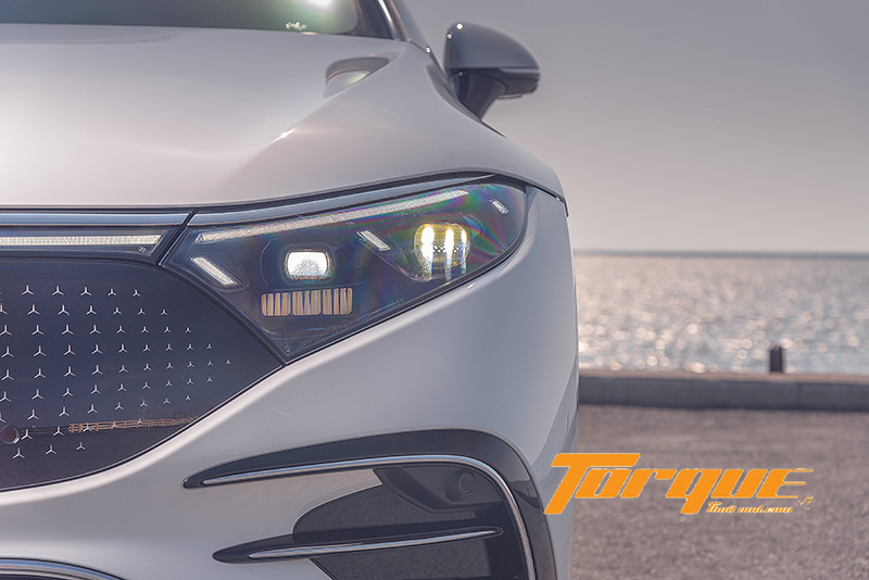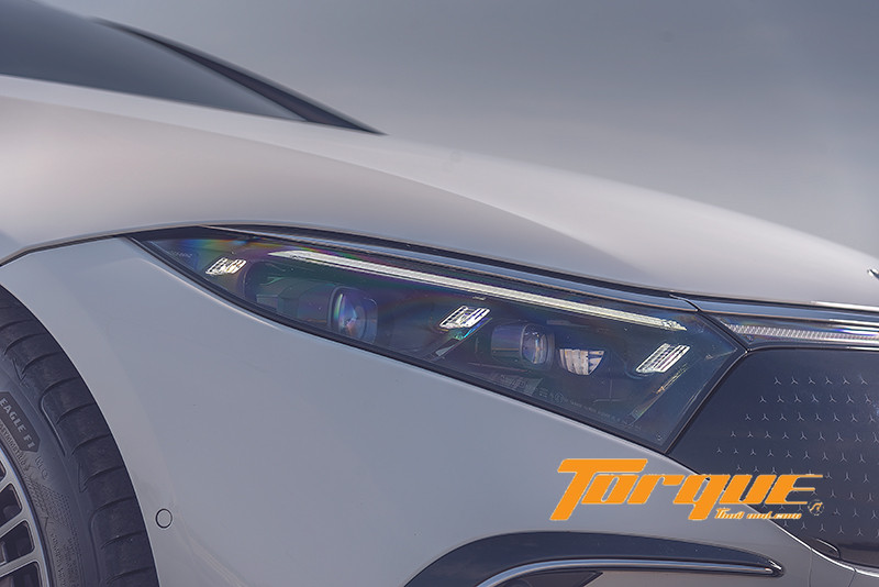 โคมไฟหน้ารูปทรงเรียวบาง มาพร้อมกับ DRL 3 จุด เอกลักษณ์ใหม่ของ Mercedes ระดับเรือธง และแถบแสงด้านบนที่พาดยาวต่อเนื่องตลอดความกว้างของรถ ไฟหลักใช้เทคโนโลยี Digital Light ซึ่งประกอบด้วย หลอด LED พลังสูงโคมละ 3 ดวง โดยมีกระจกขนาดจิ๋วมากถึง 1.3 ล้านแผ่น ทำหน้าที่หักเหและนำแสงไปยังทิศทางและในรูปแบบต่างๆ กระจกแต่ละแผ่นทำงานแยกอิสระจากกัน ซึ่งเป็นหลักการเดียวกับที่ใช้อยู่ในเครื่องฉายโปรเจคเตอร์ นั่นหมายถึง ไฟหน้าของ EQS สามารถฉายภาพและกราฟฟิกรูปแบบต่างๆ ลงบนถนนได้ ด้วยการใช้หน่วยประมวลผลกราฟฟิกอันทรงพลัง ฉายวิดีโอลงไปยังกระจกจิ๋วเหล่านั้น ด้วยความละเอียดถึง 2.6 ล้านพิกเซล