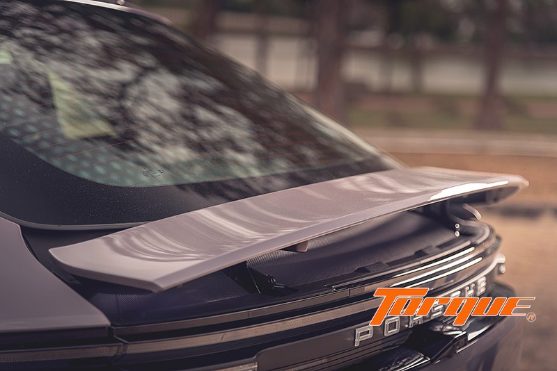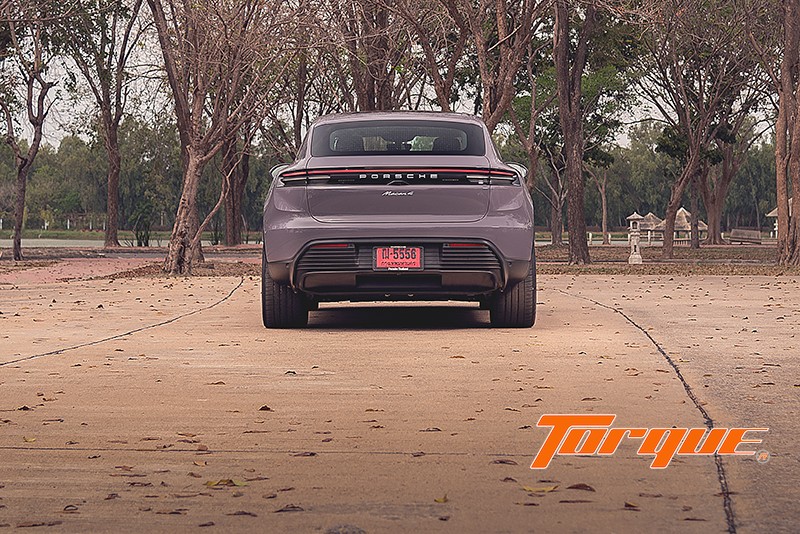 ชุดไฟท้ายดีไซน์ใหม่แบบ 3 มิติ มีแถบไฟคาดยาวตลอดความกว้างตัวรถตามสไตล์ Porsche รุ่นใหม่ และใช้ตัวอักษร ‘PORCHE’ ขนาดใหญ่ ขึ้นรูปแบบให้ดูคล้ายทำมาจากกระจกหนา ติดตั้งไว้กึ่งกลาง ถัดลงมาด้านล่างเป็นกล้องหลังที่ติดตั้งกลมกลืนลงตัวกับกรอบไฟท้ายสีดำ เมื่อเปิดฝาท้ายจะพบกับพื้นที่เก็บของขนาดใหญ่ถึง 540 ลิตร และเพิ่มเป็น 1,348 ลิตร หากพับเบาะหลังร่วมด้วย ในขณะที่ช่องเก็บของใต้ฝากระโปรงหน้าจุได้อีก 84 ลิตร… ทั้งฝาท้ายและหน้าสามารถเปิดได้ด้วยไฟฟ้าจากปุ่มที่ติดตั้งรวมอยู่กับปุ่มกระจกหน้าต่างฝั่งผู้ขับ