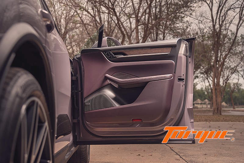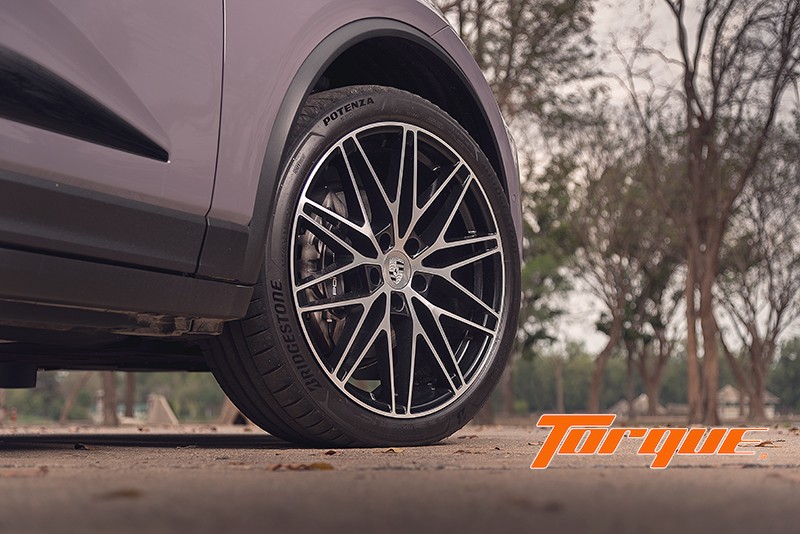 ช่วงล่างในคันทดสอบของเราติดตั้งออปชั่นถุงลม ซึ่งทำงานร่วมกับแดมเปอร์ระบบ PASM (Porsche Active Suspension Management) แทนที่สปริงขดซึ่งเป็นมาตรฐานของ Macan 4 ตัวแดมเปอร์เป็นรุ่นใหม่ที่ภายในประกอบด้วยวาล์ว 2 ชุด (จากเดิม 1 ชุด) เพื่อแยกปรับการทำงานช่วงยืดและยุบออกจากกันอิสระ ช่วยให้สามารถเปลี่ยนโหมดระหว่าง Performance และ Comfort ได้รวดเร็วกว่าเดิม นอกจากนั้น ยังส่งให้แรงดันภายในแดมเปอร์ทำงานได้อย่างมีประสิทธิภาพยิ่งขึ้นอย่างเห็นได้ชัด ช่วงล่างจึงให้การตอบสนองและเกาะถนนได้ดียิ่งขึ้น ในขณะที่ระบบเบรกถ่ายทอดเทคโนโลยีมาจาก Taycan โดยใช้แรงหน่วงจากการรีเจนฯ มาช่วยเบรกเป็นหลัก สามารถกู้คืนพลังงานได้สูงสุดถึง 240 kW เมื่อเบรกแรงพอ โดยคิดเป็น 40% การพลังเบรกทั้งหมดที่ทำได้ นั่นหมายถึง 98% ของแรงเบรกจะถูกเปลี่ยนเป็นพลังงาน! คาลิเปอร์จะทำงานเมื่อความต้องการแรงเบรกสูงกว่าที่ระบบรีเจนฯ ทำได้ นอกจากนั้น การรีเจนฯ จะไม่ทำงานหากผู้ขับยกคันเร่งโดยไม่เหยียบเบรก เพื่อให้รถสามารถไหลต่อไปได้ เป็นการเพิ่มระยะทางการวิ่งไปในตัว อย่างไรก็ตาม คุณสามารถตั้งค่าให้มีการรีเจนฯ เล็กน้อย (แบบเดียวกับ Engine Brake ของเครื่องยนต์) จากระบบ PCM… ล้อขนาด 22 นิ้ว เหมือนคันทดสอบของเรา เป็นออปชั่นอีกเช่นกัน ส่วนล้อรุ่นมาตรฐานมีขนาด 20 นิ้ว