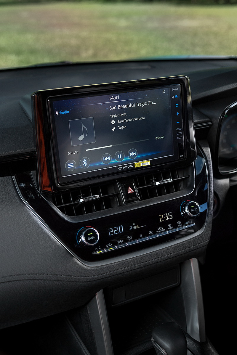 ส่วนภายในมากับการเปลี่ยนแปลงเล็กๆ น้อยๆ ในรายละเอียด เช่น การเดินตะเข็บด้ายสีเงินบนพวงมาลัย, เบาะนั่ง และพนักพิงศีรษะ ตามด้วยการหยิบเอาวัสดุโทนสีดำเงา Piano Black มาตกแต่งบนคอนโซลหน้า ก่อนปิดท้ายด้วยสัญลักษณ์ GR บนปุ่ม Push Start … ซึ่งสำหรับเราเอง บอกตรงๆ ว่ามันยังไม่ได้เติมเต็มความสปอร์ตมากมายเท่าไหร่