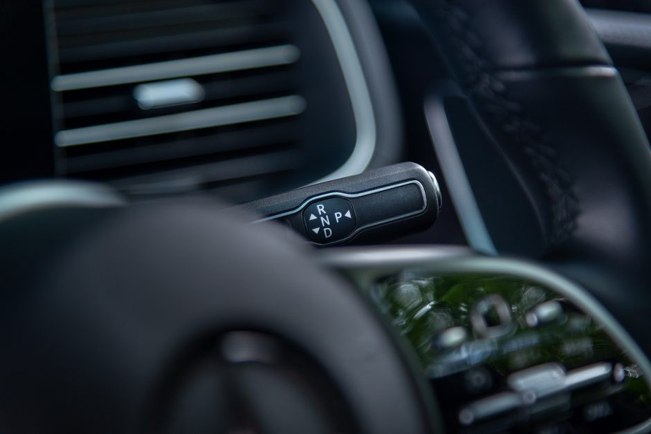 คันเกียร์ติดตั้งไว้ที่คอพวงมาลัย กลายเป็นเอกลักษณ์เฉพาะตัวของ Merc ไปแล้ว ชุดเกียร์ 9 จังหวะ “9G-TRONIC” มีอัตราทดกว้างเพื่อเฉลี่ยแรงบิดมหาศาลให้ถ่ายทอดออกมาได้นุ่มนวลและเพื่อลดอัตราสิ้นเปลืองด้วยรอบเครื่องต่ำเมื่ออยู่ในเกียร์สูงๆ ความพิเศษของชุดเกียร์ที่ใช้กับระบบขับเคลื่อนด้วยไฟฟ้าก็คือ ระบบล็อคอัพคลัตช์จะทำงานทันทีที่เริ่มออกตัว และมีคลัตช์เพิ่มขึ้นมาอีกชุดติดตั้งคั่นอยู่ระหว่างเครื่องยนต์และมอเตอร์ ปั๊มน้ำมันเกียร์แบบไฟฟ้าจะยังคงทำงานต่อเนื่องแม้ในโหมด Start/Stop เพื่อให้เกียร์พร้อมทำงานทันทีเมื่อรถเคลื่อนตัวอีกครั้ง
