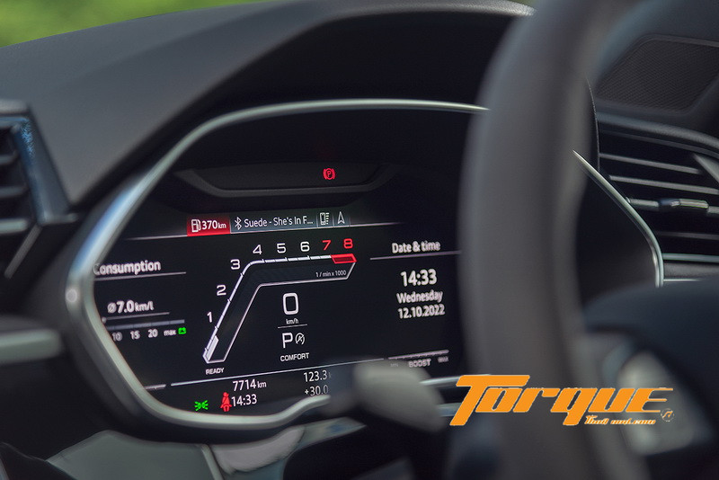 คือกุญแจสำคัญที่ส่งให้ RS Q3 มีชีวิตชีวา เมื่อรวมกับชุดเกียร์คลัตช์คู่ 7 จังหวะ ที่ใช้อัตราทดชิดในเกียร์ 1, 2, 3 และระบบขับเคลื่อนสี่ล้อ รถจึงสามารถเร่งออกจากโค้งได้อย่างฉับไว เช่นเดียวกับการแซงที่ความเร็วสูงบนมอเตอร์เวย์ ซึ่งแรงบิดทรงพลังพอที่จะพุ่งไปข้างหน้าต่อได้โดยไม่ต้องลดเกียร์ลงต่ำแต่อย่างใด