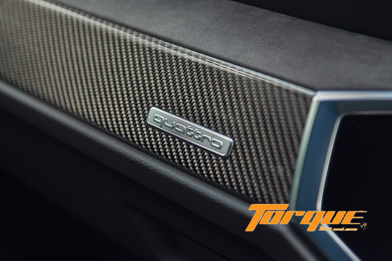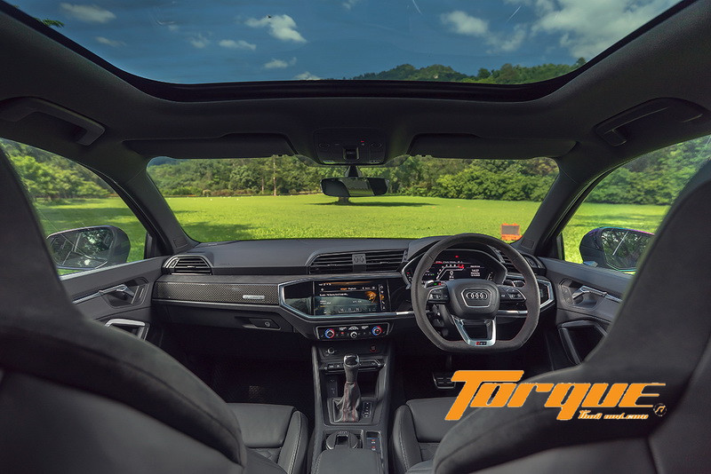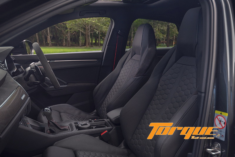ห้องโดยสารกว้างขวางน่าพอใจ เมื่อเทียบกับขนาดตัวถัง คุณภาพวัสดุและการประกอบยอดเยี่ยมตามแบบฉบับของยนตรกรรมจากยุโรป ดีไซน์โดยรวมเป็นไปตาม Q3 รุ่นมาตรฐาน ซึ่งแฝงความสปอร์ตไว้อยู่แล้ว ด้วยการโฟกัสไปที่ผู้ขับทั้งแดชบอร์ส่วนกลางที่หันเข้าหาผู้ขับ 10 องศา ตลอดจนการจัดวางปุ่มและสวิตช์ต่างๆ ที่เอื้อให้ผู้ขับสามารถใช้งานได้สะดวก มีการเพิ่มความพิเศษเฉพาะรุ่น RS ด้วยพวงมาลัยแบบสปอร์ตและหัวเกียร์หุ้มหนัง Alcantara, ปุ่มสตาร์ทล้อมด้วยสีแดง, ตกแต่งด้วยคาร์บอนไฟเบอร์ที่แดชบอร์ดฝั่งคนนั่ง และเข็มขัดนิรภัยคาดด้วยแถบสีแดง เป็นต้น