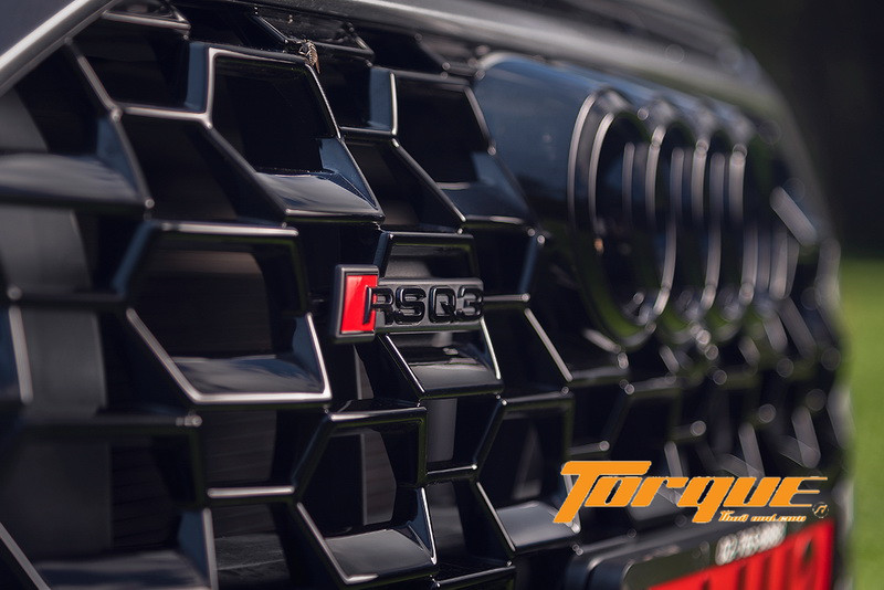 เกรด RS ถูกเพิ่มความดุดันด้วยการตกแต่งสีดำเงา (แทนที่โครเมี่ยม, สีเงิน หรือสีเดียวกับตัวรถ ใน Q3 รุ่นมาตรฐาน) ที่โดดเด่นคือกันชนหน้าซึ่งมีช่องรับอากาศขนาดใหญ่ที่ไม่เพียงแค่ความสวยงามเท่านั้น ทว่าทุกช่องยังถูกใช้ประโยชน์จริงอีกด้วย กระจังหน้าแบบชิ้นเดียวขนาดมหึมาใช้สีดำล้วนไม่เว้นแม้กระทั่งสัญลักษณ์ “สี่ห่วง” ปลายท่อไอเสียก็ใช้สีดำเงาเช่นกัน โดยชุดท่อเป็นออปชั่น ‘RS Sport’ ที่ต้องสั่งติดตั้งเพิ่มในตลาดต่างประเทศ แต่ Audi ประเทศไทย ติดตั้งมาให้เป็นอุปกรณ์มาตรฐาน ซึ่งจะให้เสียงกระหึ่มกว่าท่อเดิมขึ้นไปอีกระดับ