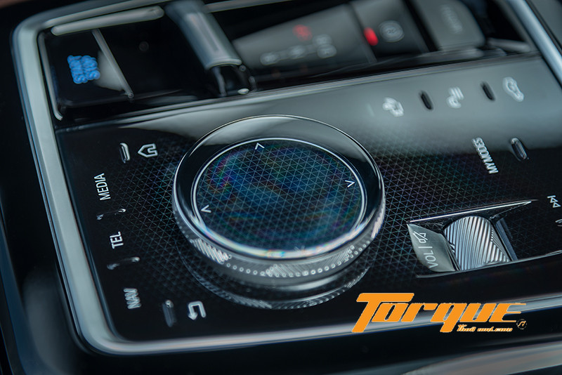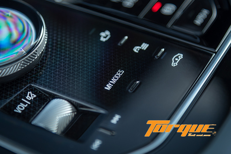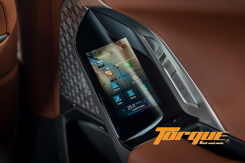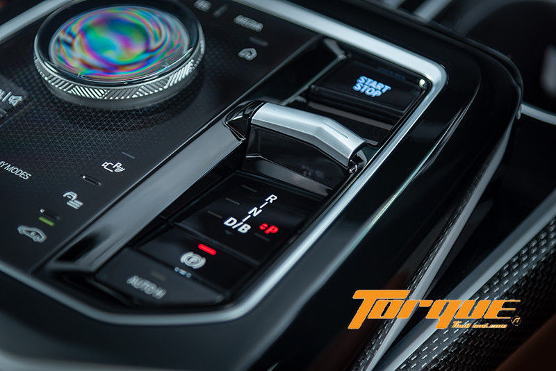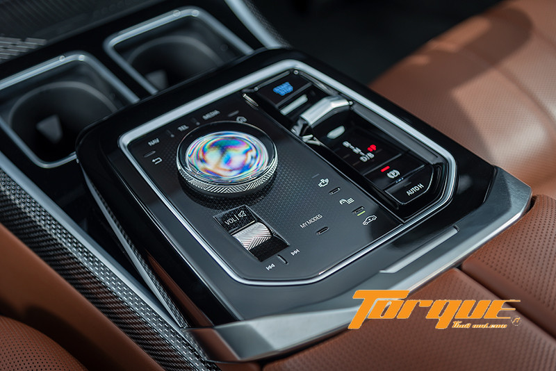 นอกจากการควบคุมผ่านปุ่มบนพวงมาลัยแล้ว แน่นอนว่าต้องมี iDrive Control เอกลักษณ์เฉพาะของ BMW ติดตั้งไว้บนคอนโซลกลาง พร้อมไฟแบ็คไลต์ช่วยเพิ่มความระยิบระยับตระการตายามค่ำคืน ปุ่มหมุนของ iDrive เป็นกระจกใสสุดหรูหรา มองทะลุลงไปเห็นลวดลายกราฟฟิกบนพื้นผิวด้านล่าง ปุ่มควบคุมรอบๆ เป็นระบบสัมผัสแบบ Haptic ทั้งหมด