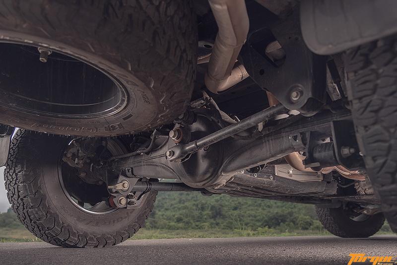 แผ่นปิดใต้ท้องที่เห็นอยู่ในภาพ เป็นเพียงส่วนหนึ่งของทั้งหมดของแผ่นป้องกัน ที่เชื่อมโยงต่อกันตั้งแต่กันชนหน้าไปจนถึงหน้าเพลาท้าย ทำจากเหล็กหนา 23 มม. ปั๊มดุนลายเพื่อเพิ่มความแกร่งขึ้นไปอีกขั้น ขณะที่แชสซีส์ก็ถูกดามเสริมความแกร่งเพิ่มเติมใน 2 ส่วนหลัก คือบริเวณซุ้มรองรับแดมเปอร์หน้าไปจนถึงใต้ประตูหน้า และที่ซุ้มแดมเปอร์หลัง เหล่านี้เพื่อรองรับแรงกระทำที่ส่งมายังช่วงล่างขณะวิ่งด้วยความเร็วสูงบนทางวิบาก