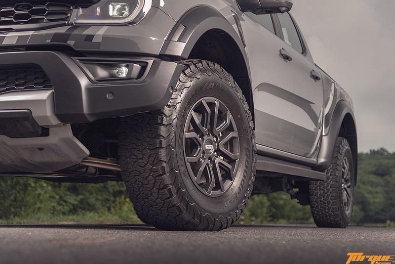 ยังคงใช้ยาง BF Goodrich ขนาด 285/70 (33 นิ้ว) และล้อขนาด 17 นิ้ว ทว่าตัวเนื้อยางนั้นแตกต่างจาก Raptor โมเดลที่แล้ว… BF Goodrich พัฒนาเนื้อยางขึ้นมาใหม่ เพื่อให้เข้าขากับช่วงล่างระบบ Live Valve โดยเฉพาะ และด้วยยางขนาด 33 นิ้ว ทีมวิศวกรของ Ford จึงยังคงใช้แดมเปอร์ขนาด 2.5 นิ้ว ซึ่งสามารถรับมือกับยางขนาดนี้ได้ เมื่อเทียบกับ Raptor รุ่นพี่อย่าง Bronco หรือ F-150 ที่มาพร้อมกับแดมเปอร์ 3.5 นิ้ว เนื่องจากใช้ยางขนาดใหญ่ถึง 37 นิ้วนั่นเอง