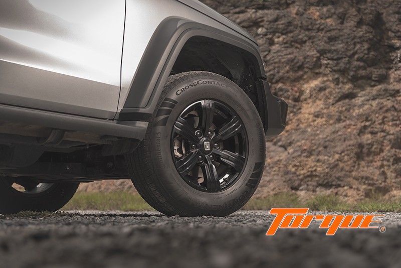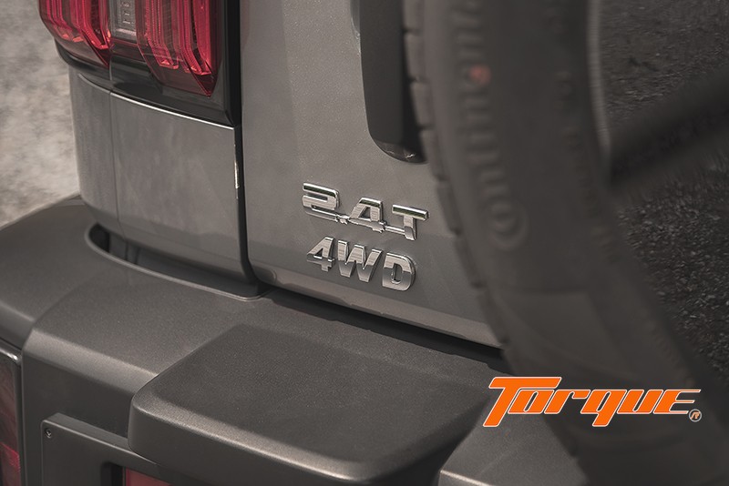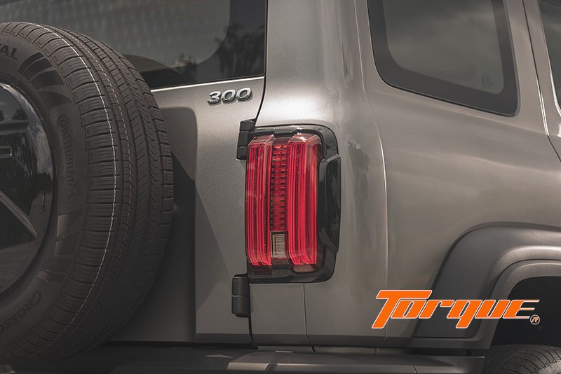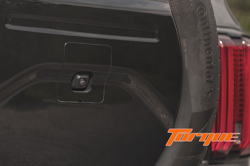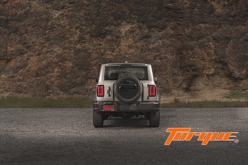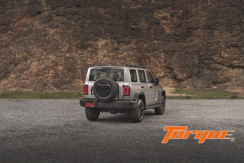 “ในมุมมองด้านท้าย โดดเด่นด้วยล้ออะไหล่ติดตั้งบนประตูท้าย พร้อมฝาปิดสีดำเงา เพิ่มความ Boxy Style (ทรงกล่อง) ด้วยชุดไฟท้ายแนวตั้งกรอบสีดำเงา เข้ากับโทนสีดำในส่วนของมือจับเปิดประตูท้าย บานพับ และกันชนท้ายสไตล์ออฟโรด