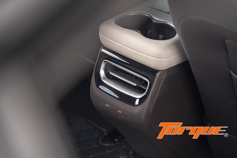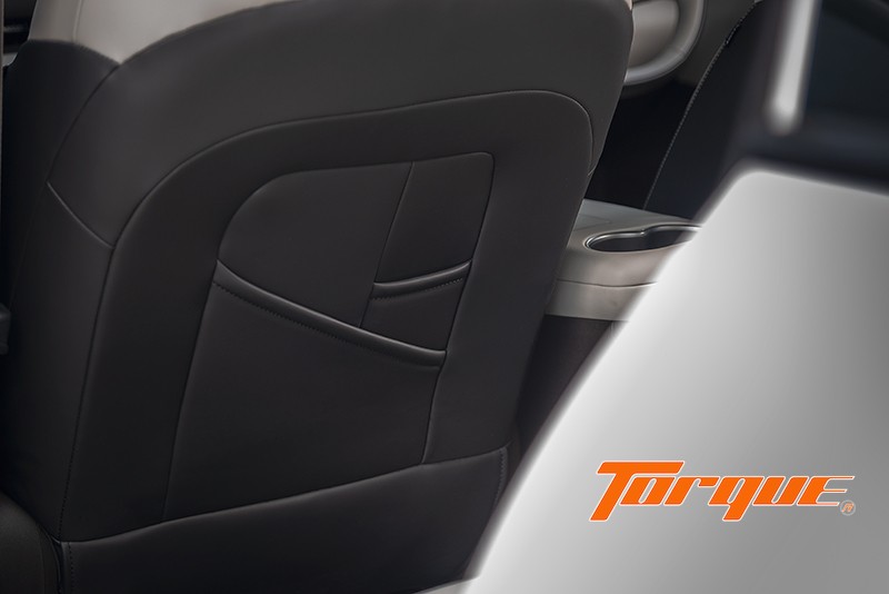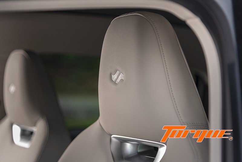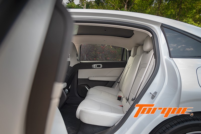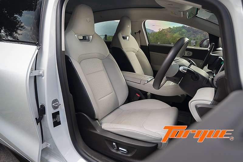 เบาะคู่หน้าปรับไฟฟ้า มีให้เฉพาะเกรด Plus หุ้มด้วยหนังสังเคราะห์ เบาะรองนั่งมีความนุ่มนวลน่าพอใจแต่พนักพิงแข็งไปหน่อย ปีกเบาะที่ยื่นออกมาเล็กน้อยช่วยโอบรับลำตัวได้ดีและไม่รู้สึกน่าอึดอัดแต่อย่างใด พนักพิงศีรษะก็อยู่ในองศาที่ไม่ดันศีรษะและปักสัญลักษณ์ของแบรนด์มาให้ด้วย ที่เบาะหลังมีพื้นที่วางขากว้างขวางมาก แต่พนักพิงเบาะแข็งและค่อนข้างตั้งตรงทำให้นั่งไม่สบายนัก สังเกตที่พนักพิงศีรษะซึ่งตรงกับส่วนลาดของหลังคาพอดี ทำให้คนตัวสูงไม่มีพื้นที่เหนือศีรษะมากนัก… หลังเบาะหน้าออกแบบให้เป็นทั้งช่องเก็บของและเสียบโทรศัพท์มือถือได้ด้วย