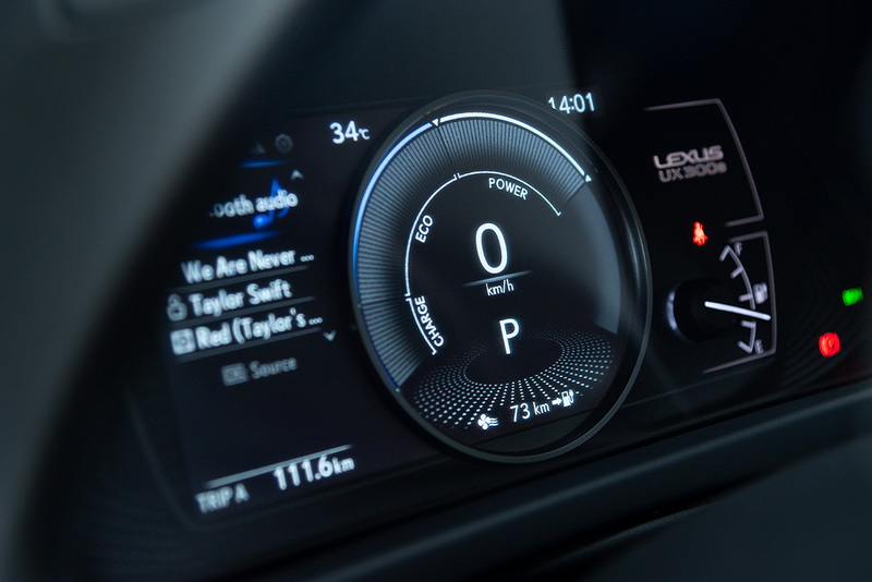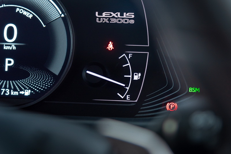 ใช้มาตรวัดแบบเข็มที่ดูเหมือนมาตรวัดปริมาณเชื้อเพลิง อาจดูเชยๆ แต่ก็ช่วยให้ทราบถึงไฟคงเหลือในแบตเตอรี่ได้อย่างเข้าใจง่าย ชุดแบตเตอรี่ขนาด 54.35 กิโลวัตต์ชั่วโมง ประกอบด้วยเซลล์ลิเธียมไอออนความจุสูงจำนวน 288 เซลล์ โดยทั้งหมดถูกบรรจุไว้ในตัวเรือนที่ซีลด้วยยางเพื่อป้องกันฝุ่นและน้ำ พร้อมระบบควบคุมอุณหภูมิแบตเตอรี่โดยใช้การลดความร้อนด้วยลม ซึ่ง Lexus ให้เหตุผลว่า เพราะมีน้ำหนักเบากว่าการใช้สารหล่อเย็นและไม่ต้องกังวลเรื่องการรั่วซึมซึ่งอาจทำให้ไฟฟ้าลัดวงจรได้… เอิ่มมม… นอกจากลดความร้อนขณะขับด้วยความเร็วสูงแล้ว ระบบยังสามารถใช้อากาศช่วยลดความร้อนขณะชาร์จแบบเร็ว (DC) ได้อีกด้วย นอกจากนั้น ยังมีระบบให้ความร้อนแบตเตอรี่เพื่อคงประสิทธิภาพการจ่ายไฟให้เสถียรขณะใช้งานในอากาศหนาวจัด