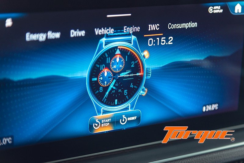 เมนู AMG แสดงข้อมูลด้านสมรรถนะต่างๆ ของรถ ด้วยกราฟฟิกที่งดงามตระการตา (แต่ก็อ่านค่ายากในบางหัวข้อ) นอกจากนั้น ยังมีกราฟฟิกนาฬิกาจับเวลาซึ่งเป็นการร่วมมือกันระหว่าง Mercedes และ IWC Schaffhausen เช่นเคย กราฟิกนาฬิกานี้ได้รับแรงบันดาลใจทั้งในด้านสีสันและรายละเอียดจากรุ่น IWC Pilot’s Watch Chronograph 41 ซึ่งเป็นนาฬิกาโครโนกราฟที่มีชื่อเสียงของ IWC