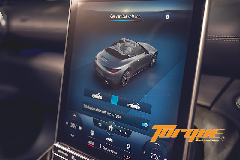 การออกแบบที่นำเอาความคลาสสิคของรถตระกูล SL ซึ่งมีต้นกำเนิดมาตั้งแต่ปี 1952 มาตีความใหม่ให้ร่วมสมัยยิ่งขึ้น ส่งให้ SL43 ยังคงสะท้อนร่างเงาของสายเลือดสปอร์ตคาร์แห่งแบรนด์ Mercedes ออกมาได้อย่างไม่ขาดตกบกพร่อง ทว่าเป็นไปในรูปแบบที่โฉบเฉี่ยวล้ำยุค และสง่างามยิ่งขึ้น จุดเด่นอยู่ที่หลังคาเปลี่ยนจากหลังคาแข็งแบบพับเก็บได้ มาใช้วัสดุผ้า ซึ่งได้เปรียบในแง่ของน้ำหนักที่เบากว่าและใช้พื้นที่จัดเก็บน้อยกว่า ด้วยโครงสร้างนี้ส่งให้ตัดน้ำหนักออกไปได้ถึง 21 กก. จึงลดจุดศูนย์ถ่วงลงได้อย่างเห็นผลชัดเจน ผ้าหลังคา 3 ชั้น แบ่งออกเป็นผ้าชั้นนอกแบบยืดหยุ่นได้ คั่นด้วยแผ่นซับเสียงทำจากวัสดุคุณภาพสูงความหนาแน่น 450 กรัม/ตารางเมตร และชั้นในสุดเป็นแผ่นบุภายในห้องโดยสาร ตัวหลังคาสามารถเปิดหรือปิดได้ใน 15 วินาที และทำงานได้ขณะขับขี่ไม่เกิน 60 กม./ชม. สั่งการโดยกดปุ่มบนบาร์ใต้หน้าจอส่วนกลาง จากนั้นจอจะแสดงแถบควบคุมหลังคา คุณต้องสไลด์ปุ่มไปทางขวา (เหมือนปลดล็อคหน้าจอมือถือ) และค้างเอาไว้จนกว่าหลังคาจะเสร็จสิ้นกระบวนการ หลังจากนั้น หน้าจอส่วนกลางจะปรับระดับตั้งขึ้น 20 องศา (จาก 12 เป็น 32 องศา) เพื่อลดแสงสะท้อนจากดวงอาทิตย์