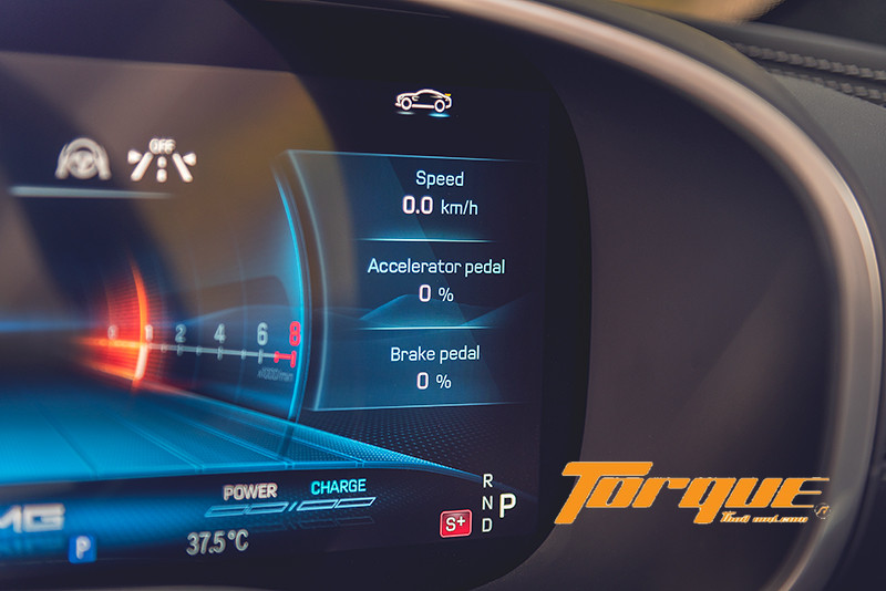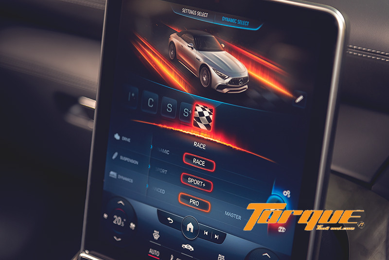 นอกจากระบบความบันเทิงแล้ว หน้าจอส่วนกลางยังเป็นพื้นที่สำหรับการแสดงผลด้านสมรรถนะของรถอีกด้วย เพียงกดปุ่ม “AMG” บนบาร์ระบบสัมผัสแบบ Haptic ใต้หน้าจอ คูณจะเข้าสู่เมนูการแสดงข้อมูลประสิทธิภาพและการทำงานต่างๆ ของรถ อาทิ แรงม้า, แรงบิด, แรงกระทำด้านข้าง ไปจนถึงสถานะของรถแบบเรียลไทม์ เช่น แรงดันลมยาง, อุณหภูมิของเหลว (น้ำมันเครื่อง, หม้อน้ำ เป็นต้น) นอกจากนั้น ยังมีเมนู AMG ‘TRACK PACE’ ซึ่งใช้ซอฟต์แวร์ร่วมกับระบบ MBUX เพื่อบันทึกข้อมูลของรถกว่า 80 รายการ อาทิ ความเร็ว, อัตราเร่ง, องศาพวงมาลัย, การเหยียบเบรก ฯลฯ ได้ถึง 10 ครั้งต่อวินาที ขณะขับขี่ในสนามแข่ง พร้อมการแสดงเวลาต่อรอบและเวลาแต่ละเซกชั่นของสนามขึ้นบนจอส่วนกลาง, กระจกหน้า (ผ่าน HUD) และจอสำหรับผู้ขับขี่ได้ โดยคุณสามารถบันทึกสนามของตัวเอง (เช่นสนามพีระฯ สนามช้างฯ เป็นต้น) เข้าไปในระบบได้ จากนั้นระบบจะแสดงองศาการเข้าโค้งและจุดเบรกที่เหมาะสมของสนาม เพื่อช่วยให้คุณสามารถหาไลน์ที่เหมาะสมได้ง่ายยิ่งขึ้น จากนั้น คุณสามารถบันทึกไลน์ต่างๆ ไว้ เพื่อให้ระบบนำขึ้นมาแสดงผลบนหน้าจอมัลติมีเดียเพื่อเป็นไกด์ในการปรับปรุงการขับขี่ของคุณต่อไปได้อีกด้วย