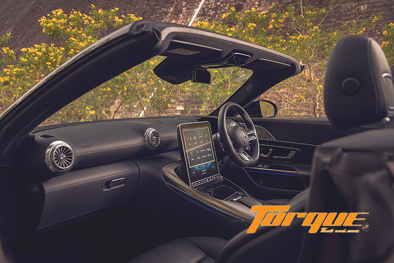 ความน่าทึ่งของ Mercedes-AMG SL43 อยู่ที่เครื่องยนต์ของมัน… ขุมพลัง 4 สูบเรียง วางตามยาวด้านหน้า มีความจุเพียง 2.0 ลิตร แต่ทรงพลังอย่างยิ่ง ด้วยตัวเลขกำลังสูงสุด 381 แรงม้า ที่ 6,750 รอบ/นาที และแรงบิด 480 นิวตันเมตร จาก 3,000 เต็มเพดานไปจนถึง 5,000 รอบ/นาที เคล็ดลับอยู่ที่การใช้มอเตอร์ไฟฟ้าติดตั้งบนแกนของเทอร์โบชาร์จ