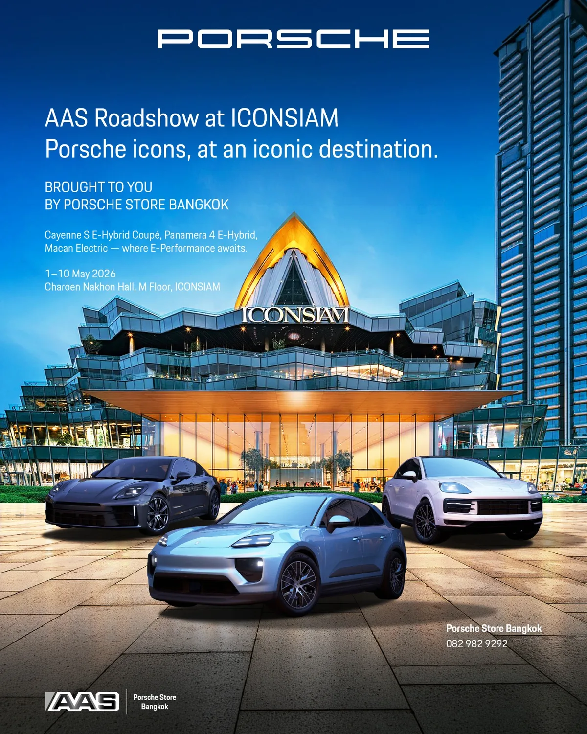 เอเอเอส ออโต้ เซอร์วิส ผู้แทนจำหน่ายรถยนต์ปอร์เช่อย่างเป็นทางการแห่งแรกในประเทศไทย จัดงาน AAS Roadshow at ICONSIAM ระหว่างวันที่ 1–10 พฤษภาคม 2569 ณ ชั้น M เจริญนคร ฮอลล์ ศูนย์การค้าไอคอนสยาม เพื่อเปิดโอกาสให้ลูกค้าและผู้สนใจสัมผัสยนตรกรรมปอร์เช่อย่างใกล้ชิด นำโดย Porsche Cayenne S E-Hybrid Coupé, Panamera 4 E-Hybrid และ Macan พร้อมรับคำแนะนำจากผู้เชี่ยวชาญและข้อเสนอพิเศษภายในงาน