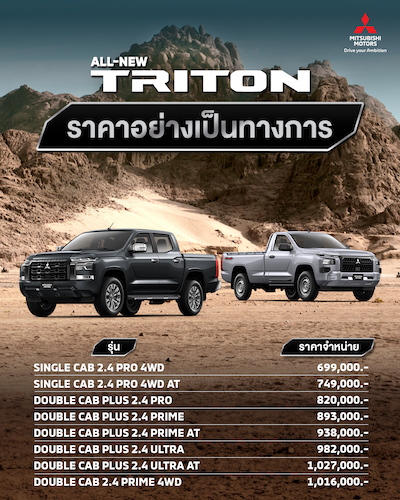 สำหรับตลาดประเทศไทย ออล-นิว ไทรทัน เริ่มจำหน่ายตั้งแต่วันที่ 26 กรกฎาคม 2566 เป็นต้นไป ณ โชว์รูมมิตซูบิชิ มอเตอร์ส ทั่วประเทศ ในราคาที่สัมผัสได้แบบสุดคุ้ม ดังนี้: