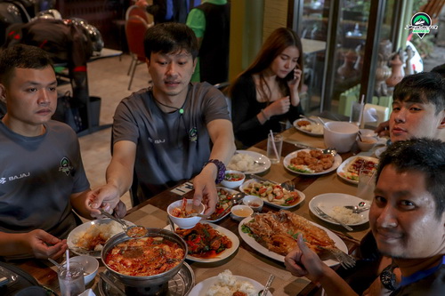 เมื่อล่องแก่งกันอย่างสะใจหมดแรงกันไปเยอะ ถูกเติมเต็มแบบรู้ใจด้วยการฝากท้องที่ร้านช่อชะมวง ร้านอาหารบรรยากาศดีประจำนครนายก ที่ไม่ว่าใครผ่านไปผ่านมาก็รู้จัก งานนี้จัดเต็มอิ่มท้องกันทั้งชาวคณะที่ร่วมกิจกรรม เมื่ออิ่มใจอิ่มท้องกันแล้วก็เคลื่อนขบวน Dominar 400 มุ่งหน้ากลับที่โชว์รูมกันอย่างปลอดภัยจากนั้น