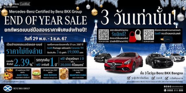 ทำให้ลูกค้ามั่นใจได้ว่าจะได้รถที่ปลอดภัย คุณภาพดี ในราคาที่คุ้มค่า พร้อมอัดดีลพิเศษส่งท้ายปีที่งาน Mercedes-Benz Certified by Benz BKK Group : End of Year Sale 2024 จัดขึ้นระหว่างวันที่ 29 พฤศจิกายน – 1 ธันวาคม 2567 3 วันเท่านั้น!!