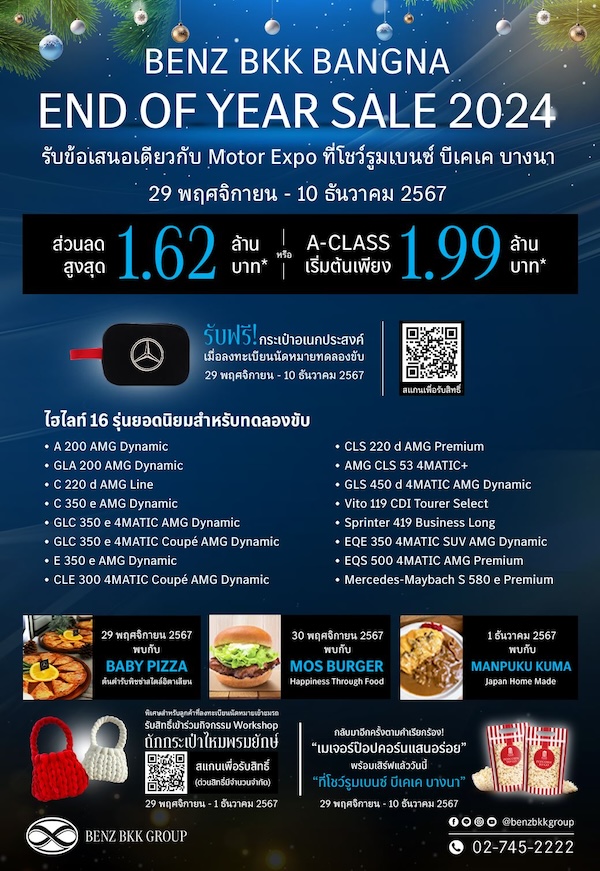 ได้สัมผัสประสบการณ์พิเศษ ที่มากกว่าการเป็นพื้นที่จัดแสดงรถ และศูนย์บริการทั่วไป ตอบโจทย์ทุกไลฟ์สไตล์การใช้ชีวิตที่สามารถจับต้องได้ อีกทั้งยังอัดแคมเปญ “Benz BKK Group : End of Year Sale 2024” กับดีลที่ดีที่สุดส่งท้ายปี มอบส่วนลดสูงสุด 1.62 ล้านบาท