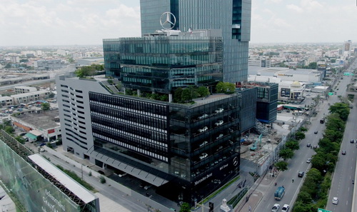 โดดเด่นด้วยโลโก้ดาวสามแฉกของ Mercedes-Benz ที่ตั้งตระหง่านบนยอดตึก และ Car Display Box 4 ชั้น ด้านหน้าอาคาร ที่สามารถมองเห็นรถยนต์เมอร์เซเดส-เบนซ์จอดตระการตาผ่านบานกระจกใส ให้ชมตั้งแต่ชั้น 1 ถึงชั้น 7 ทั้งจากบนทางยกระดับบูรพาวิถี และถนนเทพรัตน
