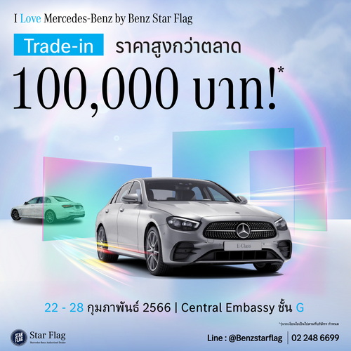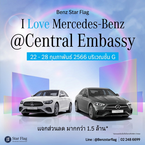ระหว่างวันที่ 22-28 กุมภาพันธ์ 2566 ณ บริเวณชั้น G ศูนย์การค้า Central Embassy เพื่อให้ลูกค้าชวนคนที่รักมาเลือก และออกรถกับ เบนซ์ สตาร์แฟลก พร้อมรับโปรโมชั่นสุดคุ้มที่จัดให้เป็นพิเศษมากมาย”