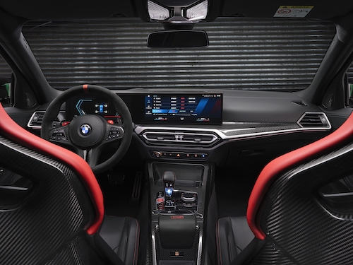 ภายในห้องโดยสารของบีเอ็มดับเบิลยู M3 CS มาในดีไซน์แบบรถสปอร์ตที่ได้รับการออกแบบโดยคำนึงถึงสุนทรียภาพในการขับขี่และสมรรถนะขั้นสูงสุด เบาะนั่ง M Carbon ทรง bucket seat จากหนัง Merino มาในสีดำตัดแดง พร้อมลวดลายการเย็บแบบพิเศษ แผงประตูด้านหน้าและด้านหลังบุด้วยหนังสีดำ แผงคอนโซลกลางที่ทำจากคาร์บอนไฟเบอร์ตกแต่งด้วยตัวอักษร CS สีแดง