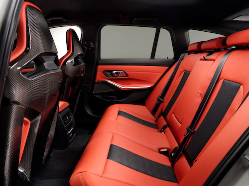 ห้องโดยสารของบีเอ็มดับเบิลยู M3 Competition M xDrive Touring ใหม่ ตกแต่งในดีไซน์ M ด้วยวัสดุคาร์บอนไฟเบอร์ มาพร้อมกระจกมองหลังตัดแสงอัตโนมัติ กระจกมองข้างฝั่งคนขับและกระจกมองหลังตัดแสงอัตโนมัติ นอกจากนั้น เข็มขัดนิรภัยดีไซน์ M เบาะนั่ง M Carbon ทรง bucket seats เบาะนั่งตอนหน้าปรับไฟฟ้าพร้อมระบบจำตำแหน่งเฉพาะฝั่งคนขับ ระบบปรับอากาศอัตโนมัติแบบ 3 โซน