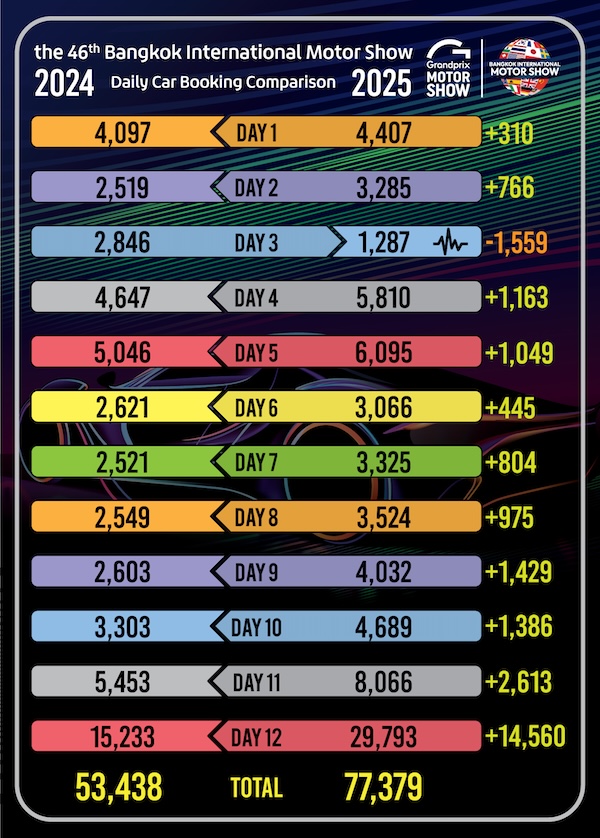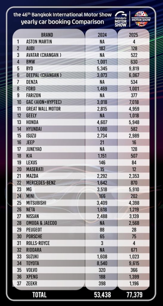 จากการรวบรวมตัวเลขยอดจองรถยนต์ภายในงาน 5 อันดับแรก ประกอบด้วย BYD มียอดจองรวม 9,819 คัน TOYOTA มียอดจองรวม 9,615 คัน GAC มียอดจองรวม 7,018 คัน DEEPAL มียอดจองรวม 6,067 คัน และ HONDA มียอดจองรวม 5,948 คัน