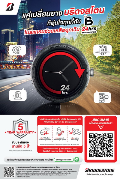 บริษัท บริดจสโตนเซลส์ (ประเทศไทย) จำกัด จัดโปรโมชั่นพิเศษ “B-24 hrs. บริการช่วยเหลือฉุกเฉิน 24 ชั่วโมง ฟรี 1 ปี” มอบสิทธิพิเศษสำหรับลูกค้าที่ซื้อยางบริดจสโตนที่ร่วมรายการ ทุกรุ่น ทุกขนาด จำนวน 4 เส้น ต่อรถ 1 คัน 1 ทะเบียนรถ ยกเว้นรุ่นที่มีลักษณะการใช้งานในเชิงพาณิชย์ ได้แก่