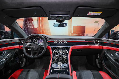 แผ่นไม้วีเนียร์แบบทูโทนแถบบนรังสรรค์จาก Granite Stone มอบผิวสัมผัสที่ไม่เหมือนใคร ในขณะที่แผ่นไม้วีเนียร์แถบล่างรังสรรค์เป็นเฉดสีดำ Grand Black พร้อมตัวอักษร “20 YEARS OF THE CONTINENTAL GT” สลักด้วยเลเซอร์ และแถบสีแดงคาดเป็นแนวนอนพาดผ่านคอนโซลกลางจากประตูหนึ่งสู่อีกประตูหนึ่งผ่านแถบบนของช่องแอร์เพื่อแยกพื้นผิวทั้งสองส่วนออกจากกัน