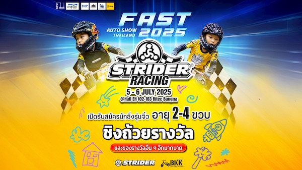 พร้อมขอฝากกิจกรรมสำหรับนักซิ่งฟันน้ำนม กับการแข่งขันจักรยานขาไถ “Strider Racing @Fast Auto Show Thailand 2025” บนสนามแข่งมาตรฐาน สำหรับเยาวชนอายุ 2 – 4 ปี จัดแข่ง 2 รุ่น คือ รุ่น Enjoy และรุ่น Racing รวม 14 รุ่น เพื่อชิงถ้วยและเหรียญรางวัล ในวันเสาร์ที่ 5 และวันอาทิตย์ที่ 6 กรกฎาคม สมัครออนไลน์ได้ถึงวันที่ 30 มิถุนายน ศกนี้